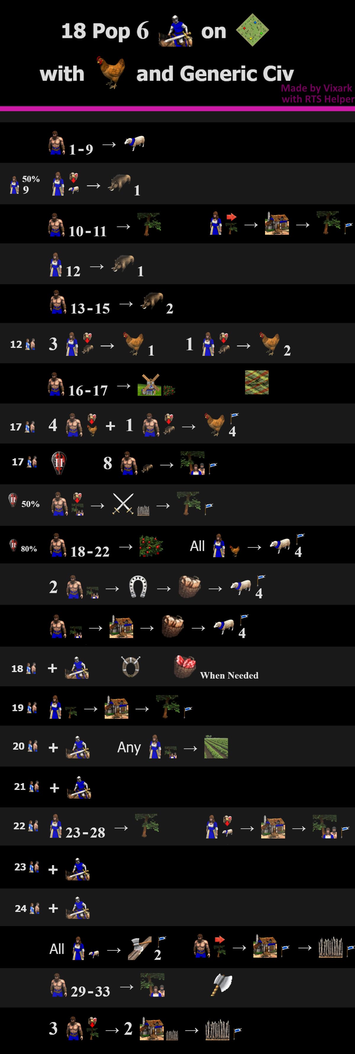 Chickens are certainly is slower to gather than pushing deer, but you still can have good enough gather rate with them. So to test the limits of what you can do with chickens I wanted to see how early you could advance with them with feudal age and still be able to produce units and villagers. So this is what I got: A 18 pop scouts rush with chickens for a generic civ.