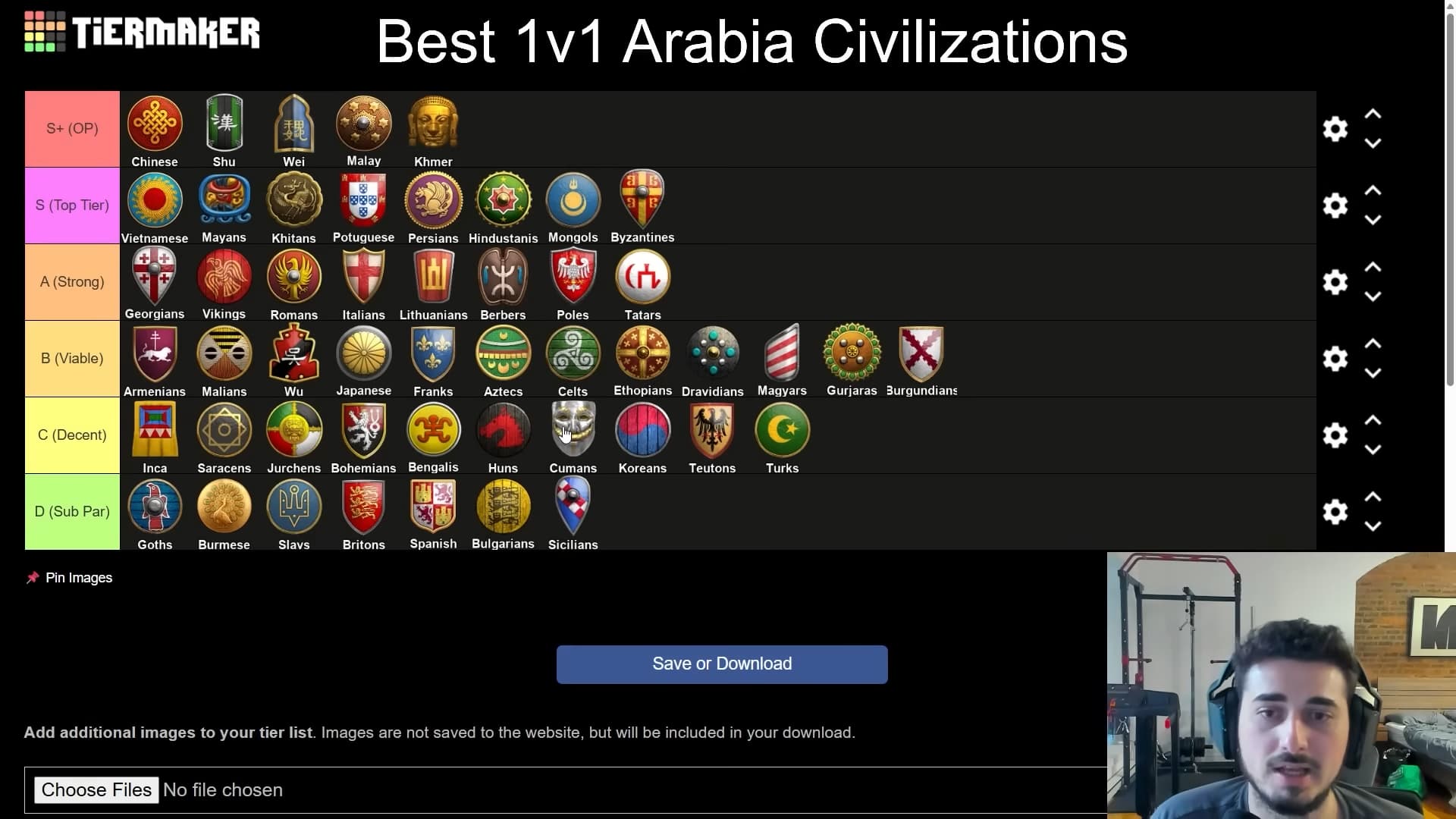 Given his playstyle I thought he’d put Jurchens, Magyars and Burmese a tier above where he put them and Celts, Dravidians a tier below. And I might be wrong about this but I think he’d place Wei a tier below after playing them in practice sets for KOTD. That civ is good but has many weaknesses to be considered S-tier. Also don’t understand why he dropped Khitans, Mongols, Mayans and Portugese to A-tier compared to his previous tierlist in late July. Maybe something to do with the current ladder version of Arabia.