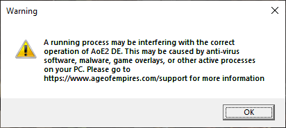 Since today, I haven’t been able to play Age of Empires DE II (Microsoft Store) because the following error message appears: “A running process may be interfering with the correct operation of AoE2 DE. This may be caused by anti-virus software, malware, game overlays, or the active processes on your PC.”