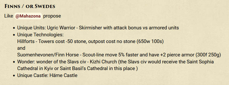 If it were a Swedish civ (which could also represent Finno-Ugric) then they could get a Regional Unit along with a Viking civ - so that a Viking civ would have at least one more modern Scandinavian Unit.