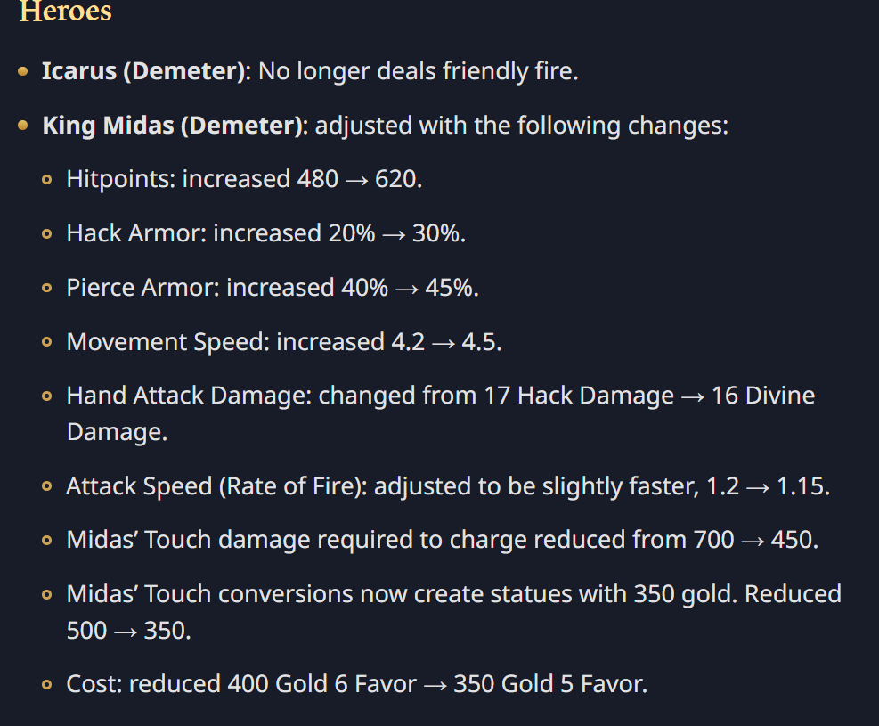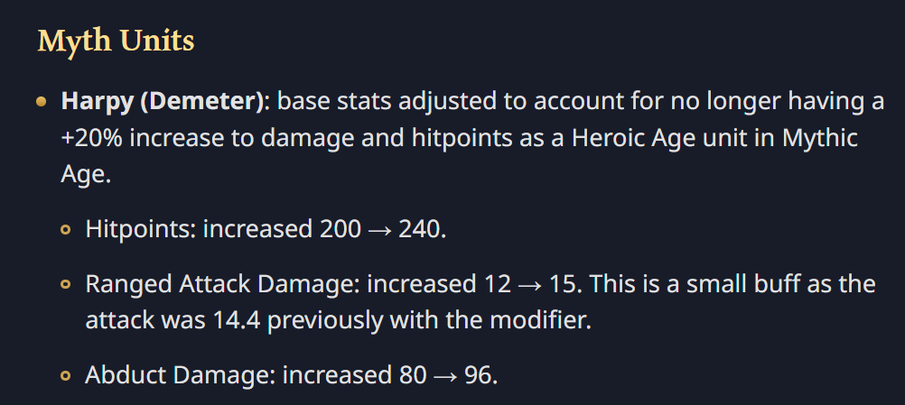 I really liked the Hera switch and think giving her medusa pairs well with her increased favor. Though I agree the myth unit tech synergy would be better if harpies worked and she got them instead of myrmidons with argive. Also fated arrows doesn’t interact with Medusa like Apollo’s sunray. I think they still have a lot more to do on Demeter, but Hera seems a lot more synergistic with her.