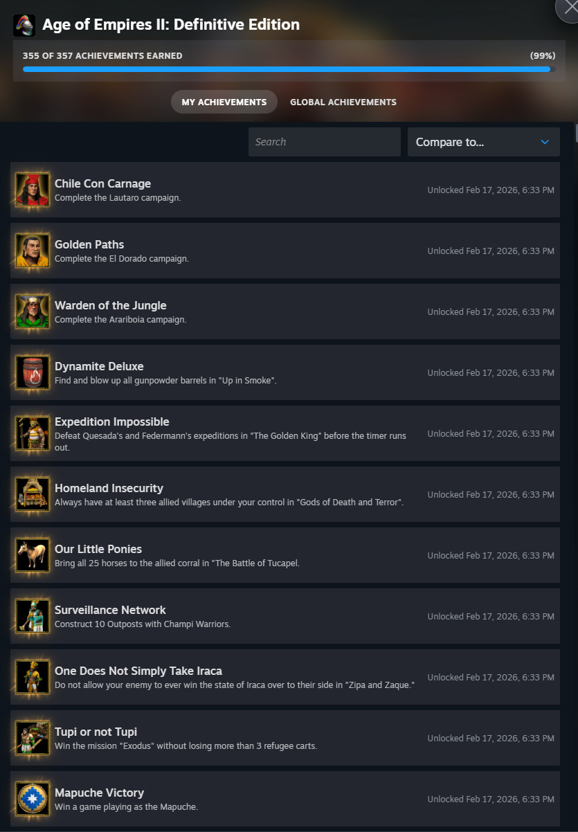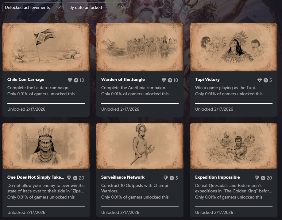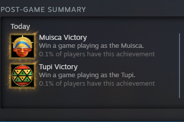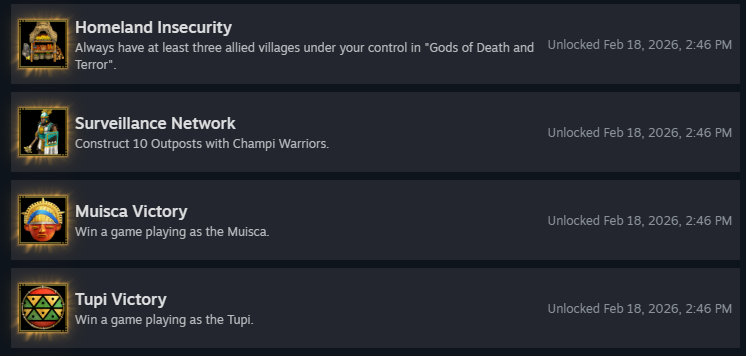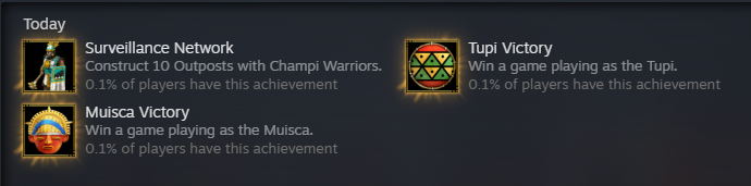 I got these four. It’s honestly sad, I was looking forward to earning these achievements myself. I can still play the new civilizations but it doesn’t feel right knowing that wouldn’t be earning the achievements fairly. At least I got the Mapuche victory achievement normally.
