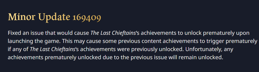 I should’ve waited for one or two days before playing the new DLC. That’s what I get for getting too excited. I do hope the devs will address this issue of not being able to win the prematurely unlocked achievements properly again. Hopefully they might introduce new achievements to make up for this.