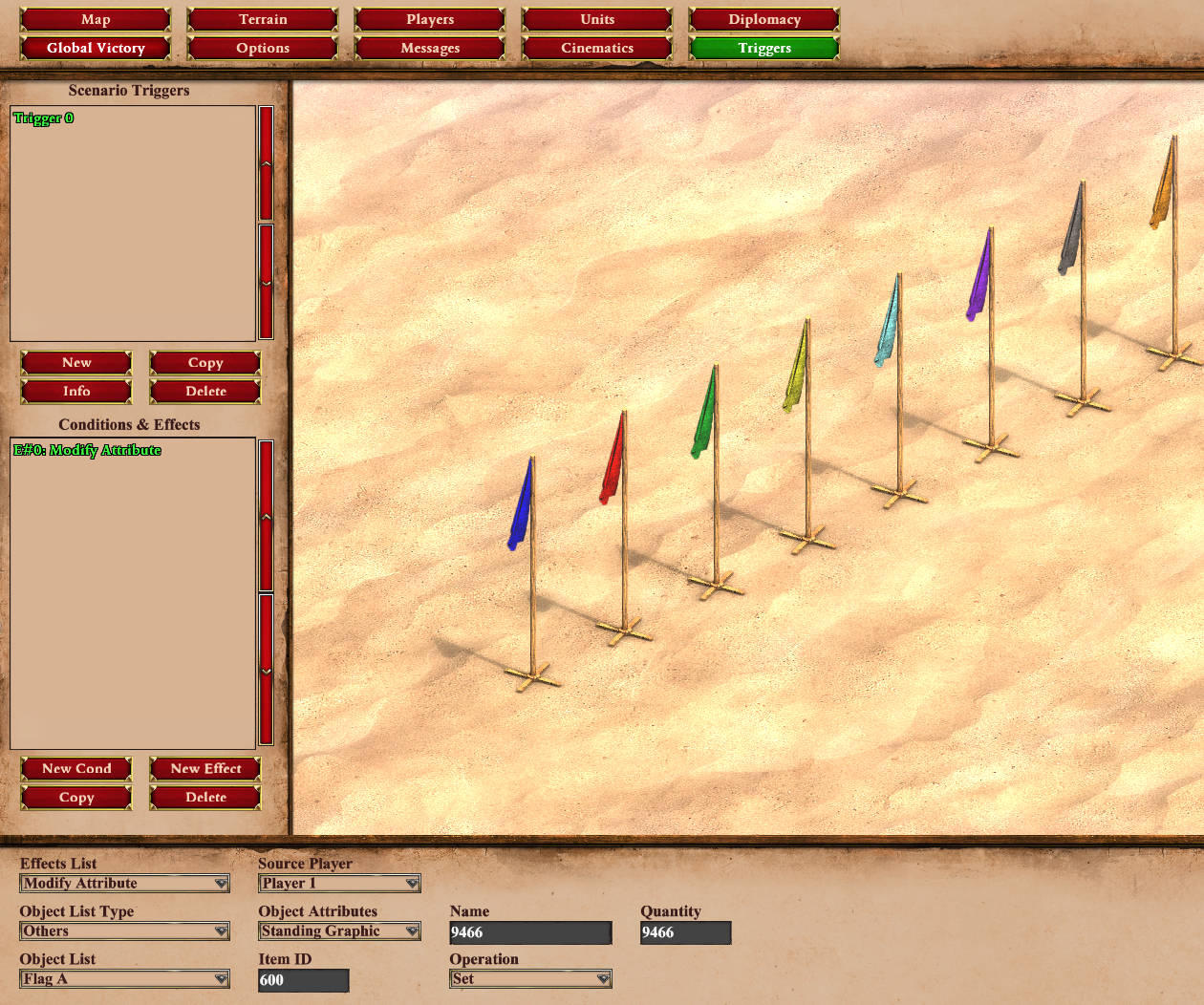could you post a screnshot how you did it in the scenario editor? I wanted to make a scenario of them in every player color to see if it is easier to recognize them, but i dont know how to change a âFlag Aâ to one of them.
