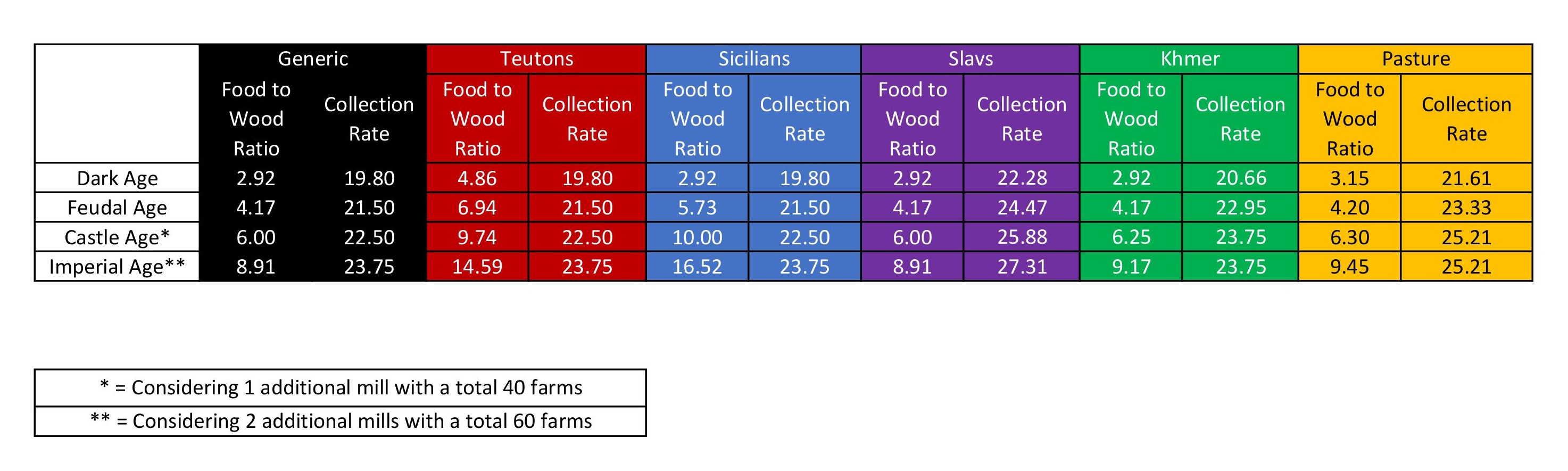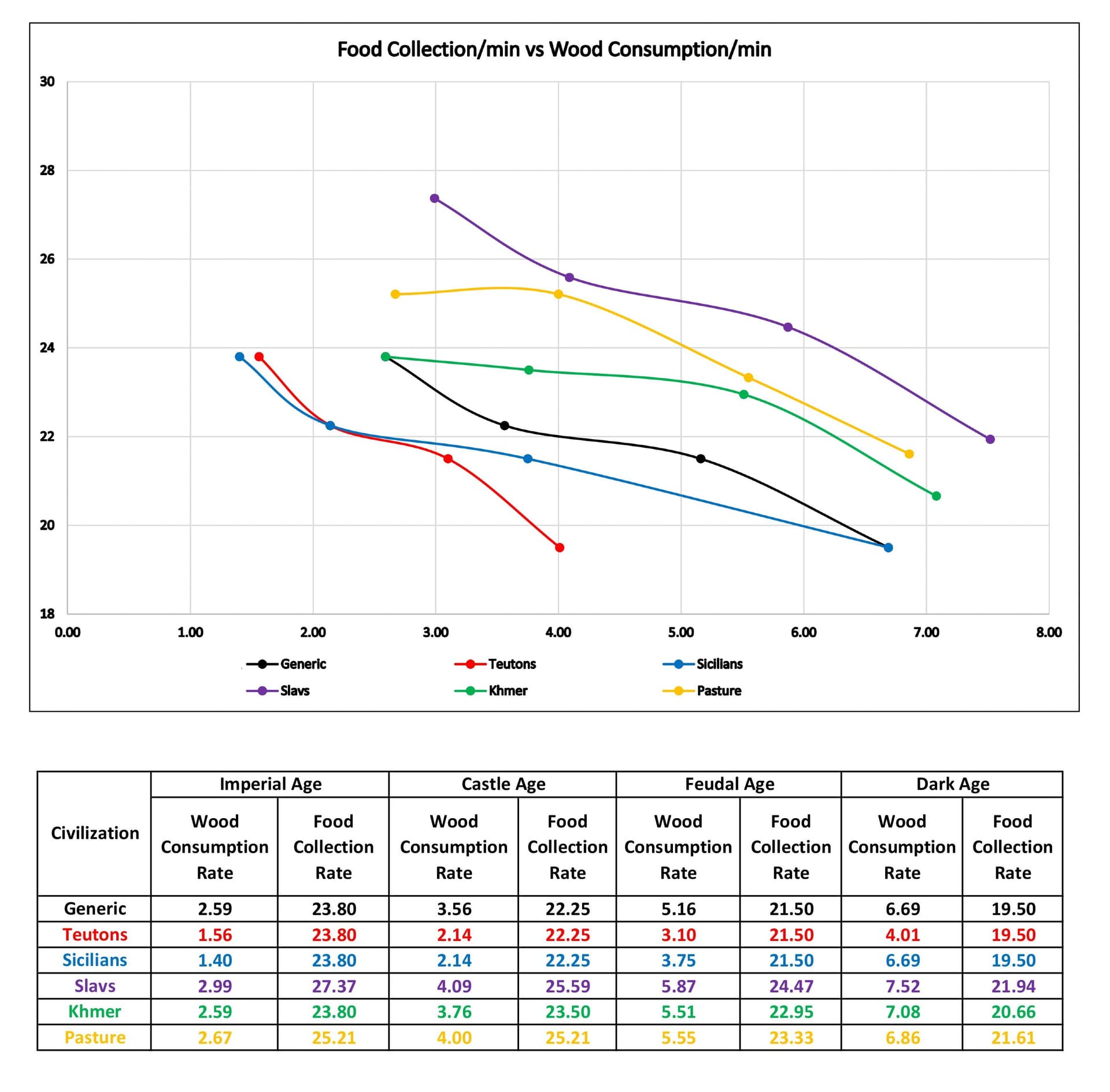 I’ve seen a lot of pasture analysis. But surprised to see no one had considered the wood savings that pasture provides. Not only pasture has slightly better food to wood ratio, but also provides a tent for herders to drop off. The wood savings is also very significant to account imo. So here I have plotted Food Collection Rate vs Food to Wood ratio for pasture and then compared with some other civs that has bonus for either of the two.
