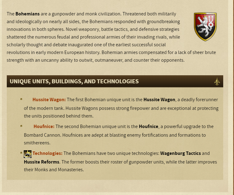 Ok i am little disappointed that they focus whole civ only on husits. Lazy from them i guess. No Kutná Hora, no Defenestration, just some boost of wagons. I dont like these type of UT.
