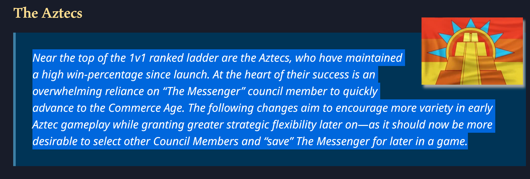 You also seem combative in this post and others while not showing much knowledge, again trying to use civ grid beyond its capacity (also old dev data no one has access to, so its probably not good to use as example for aztecs since only devs have it). Prehaps if you want to show us all wrong, and refuse to spend time seeing why no one but you is calling for haude eco boosts at the expense of other modes or identity, try find a way to improve their eco in teams without ruining their other modes balance. Because anyone who saw the lakota rework knows you will loose some early game for late game, and most would say it still left them vunerable in most modes. So what you are calling for has issues, that you dont seem to care if they nerf the civ in modes you dont use them in, which seems selfish, and isnt guaranteed to fix or address issues. End of day devs decide but ive layed out reasons i think your ask isnt worth it, and judging by deleted posts and other engagements youll continue to be mad and try and just justify your want over a productive conversation of pros and cons, potential postive change for all players. So maybe try and think of better solutions instead of self serving ones, or ones that benefit more people than turn away, while looking at maybe accepting your wants may not align fully with a playerbase.