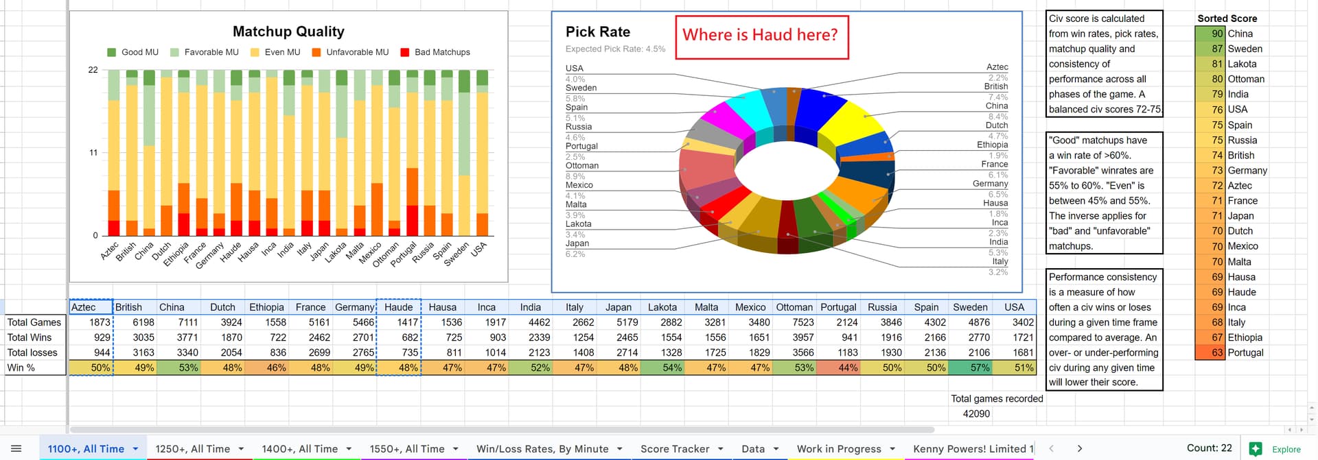 The civ grid, reset with patch, its currently 13 week old. Data before the patch haude had so many too good or too weak matchups win rate, and if you werent cherry picking data and read up on discussion there youd see a post where i did statistical analysis on both brit and haude win rates and note haude win rate is too variable and unstable, meaning grid for them is inconclusive outside of internal matchups lol. You either are misrepresenting on purpose of need to spend more time with stats. We also had fluctuations of least use, with italy african civs and dutch taking spots there. Midway through haude was top 3 civ in 1v1 btw, but fluctuated alot making steep up and downs. So clearly its not just power effecting pick rate. Id recomend learning stats better before trying to cherrypick stuff as stats are only as good as the person interpeting them.