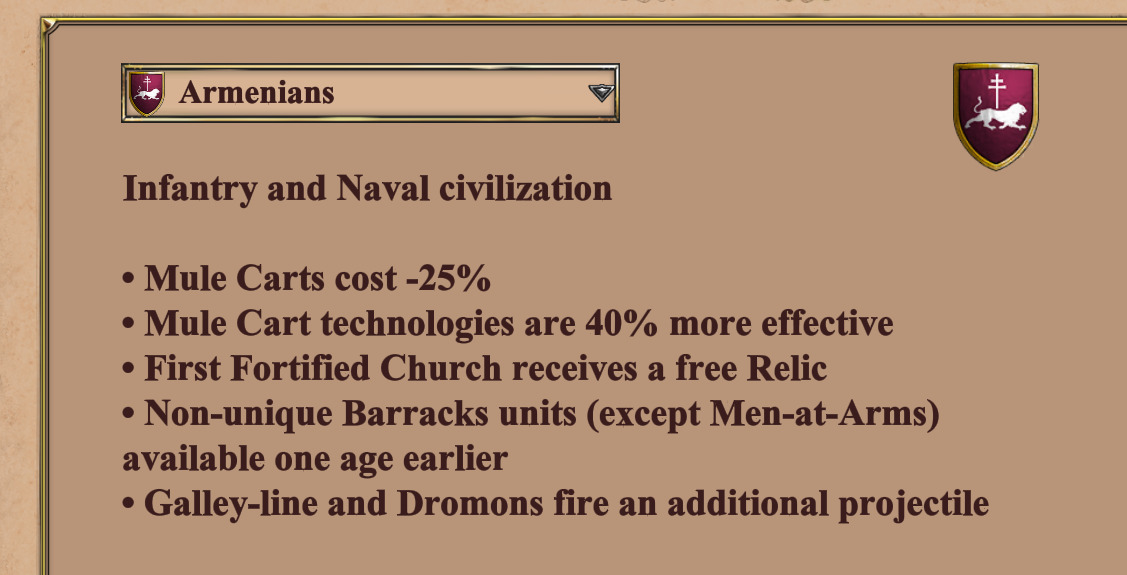 The Armenians have the Bonus “Barracks units (except man-at-Arms) are available one age earlier.”. Which is a pretty open description that leads one to think you should also be able to train condos in castle age in a game with an Italian ally. This is sadly not the case. So either the description is wrong or the Bonus not implemented correctly. In my mind this should be adressed…