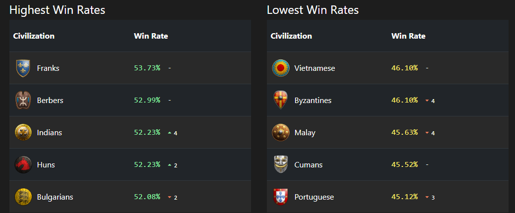 and no. i never said they were the worst civ. just that they were nerfed when the stats show they were average at best. if you were talking about gurjaras or Mayans i could see nerfing them without compensation because they have a MUCH HIGHER WINRATE. but nerfing a civ sitting at 49% winrate pre nerf and saying âitâs fine?â nah man. they deserve some love elsewhere. Same with Koreans and a few other civs.