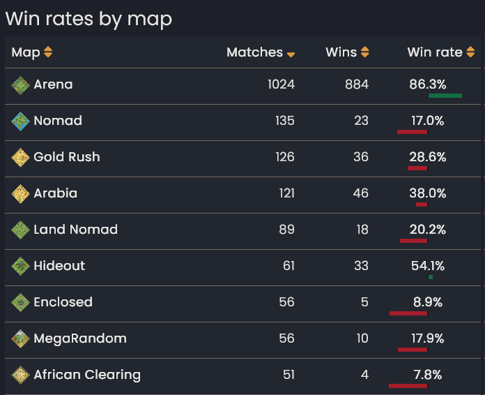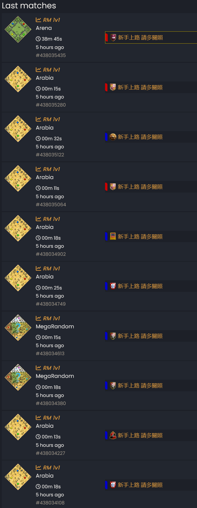 I reported him thrice via the official Age of Empires Support, providing screenshots such as above + his recent games list where we see all non-Arena games last 10 seconds. “Actions were taken” once, the two other times I was told that “due to technical limitations, we were not able to determine that this player violated the Code of Conduct”, the document that explicitely says resigning early is forbidden. The fact that such cases that absolutely aren’t in any gray zone aren’t dealt with when reporting manually is annoying but I won’t talk further about manual reports here.