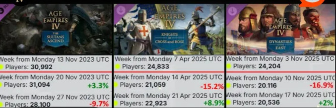 Sorry for the poor quality, as you can see the game DLC peaks are going down in numbers and players are loosing interest much quickly. Not to mention, that the aoe4 numbers we have today are thanks to sultans ascend which boosted the numbers from 7k to 17k avg, with 30k peak, so if anything, these DLC are not mantaining any of the numbers that Sultans Ascend granted aoe4.