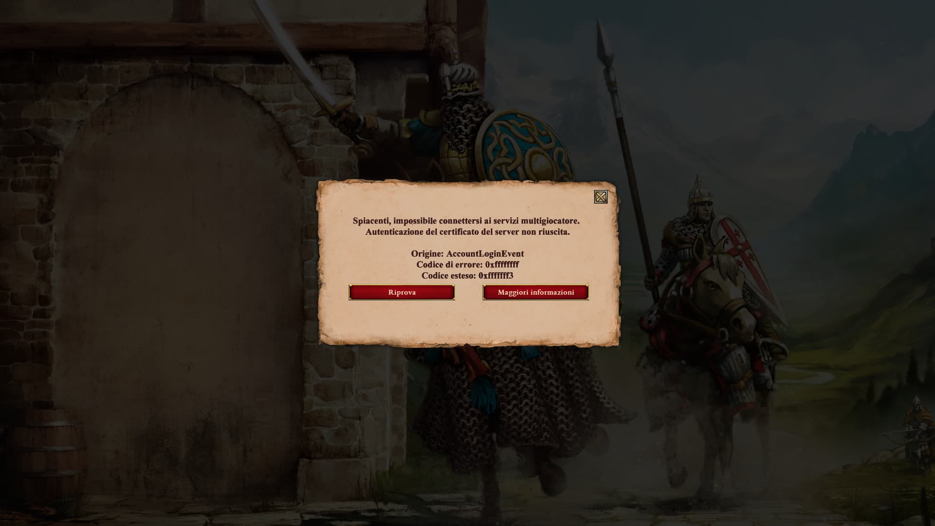 edit: The prompt says: “Sorry, impossible to connect to multiplayer services. Server certification autentication failed.”