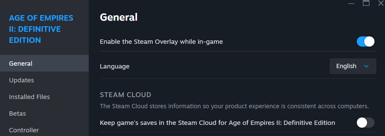 Re-enable Steam Cloud in Steam’s Properties for AoE II DE.