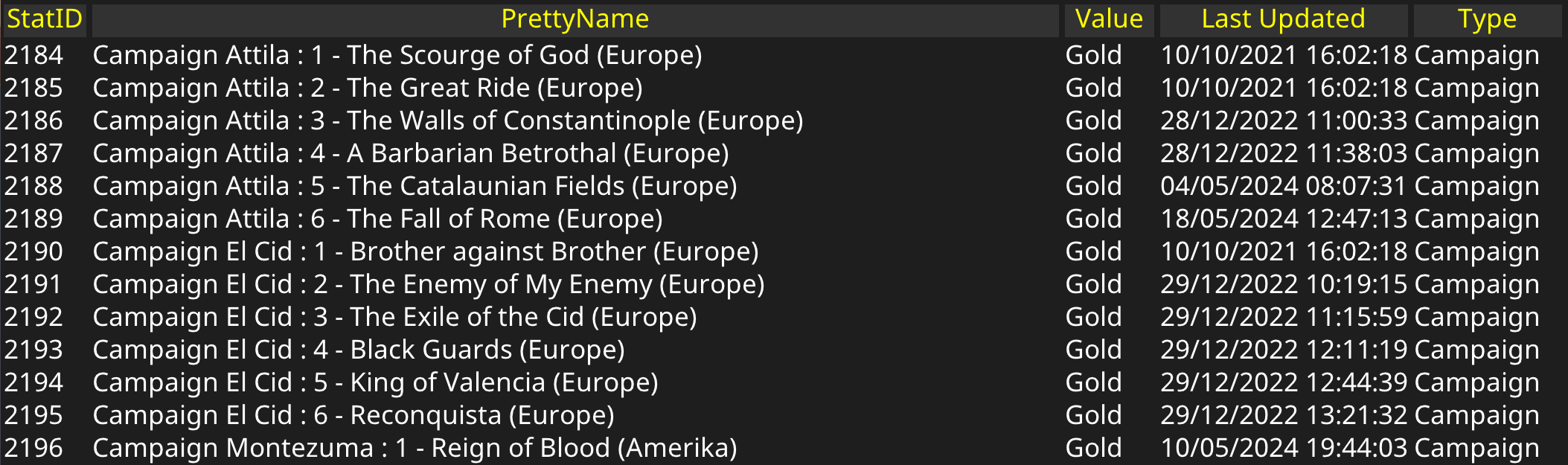 So what’s missing from all profiles—not even displaying as “0/n” like other unfinished campaigns? Every Caucasus / Mountain Royals campaign (Thoros, Tamar, Ismail) and all Victors & Vanquished scenarios.