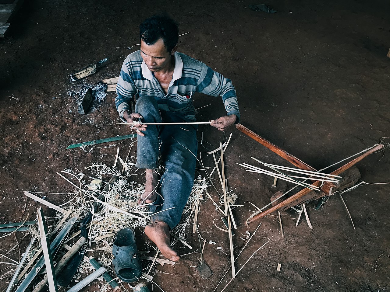 Jarai tribesman (the Jarai are one of the descendants of Champa) from Ratanakiri in northeastern Cambodia making a crossbow