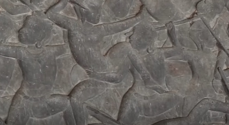 Cham infantrymen taking turns throwing their javelin, reproduced from the stone carvings at Angkor