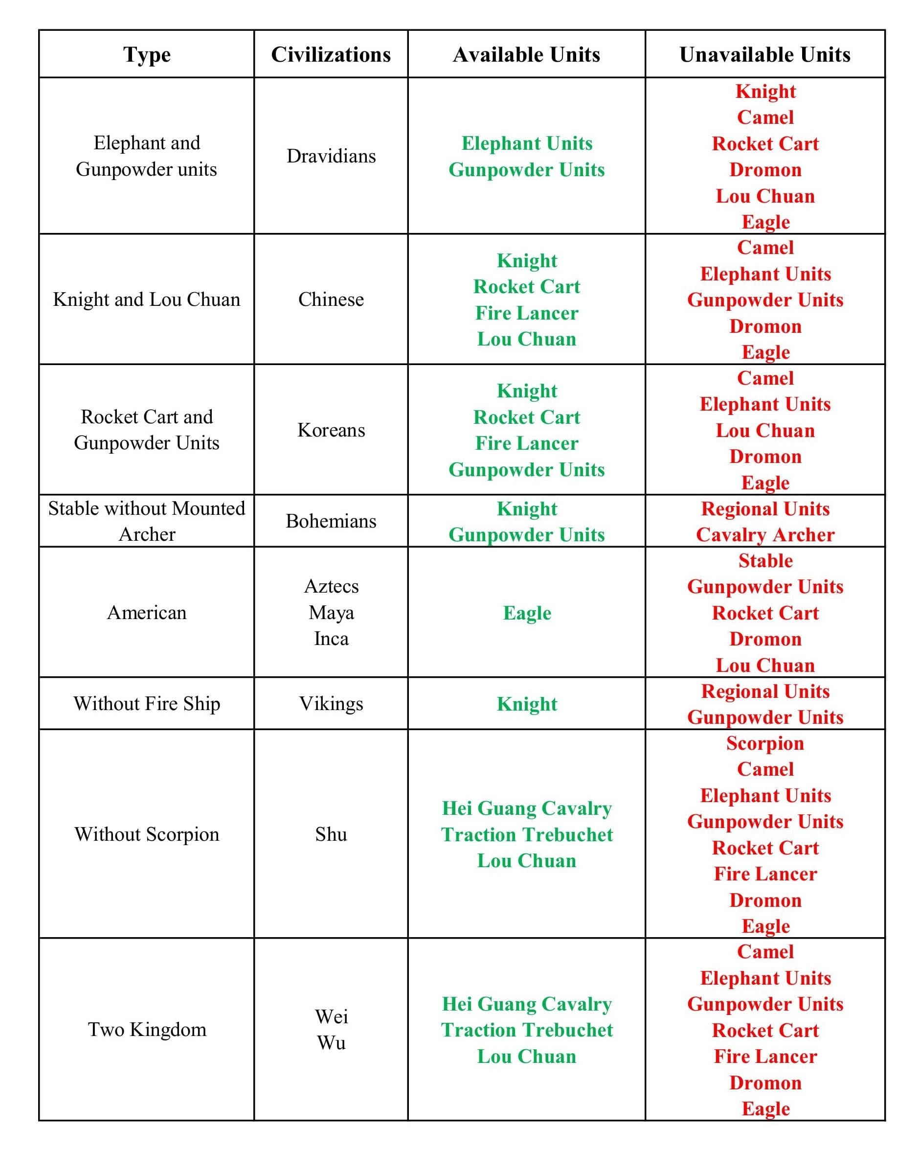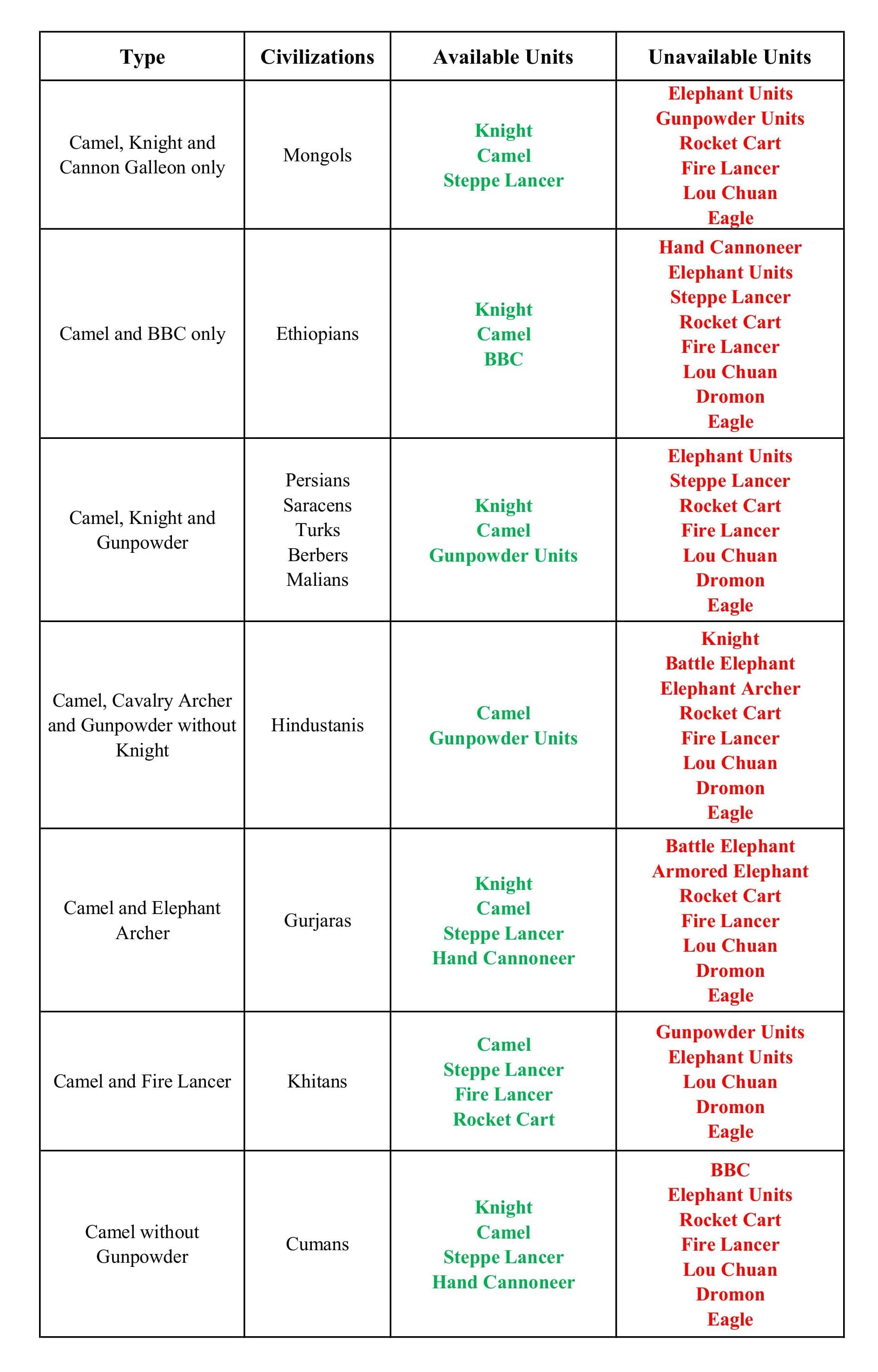 Officially the civilizations are classified as either Infantry/Archer/Cavalry or other military unit types. But this doesn’t give you any idea about what units the civilization have. For example, Spanish and Chinese both are officially classified as “Gunpowder Civilization”. But they don’t share a single Gunpowder Units with each other.