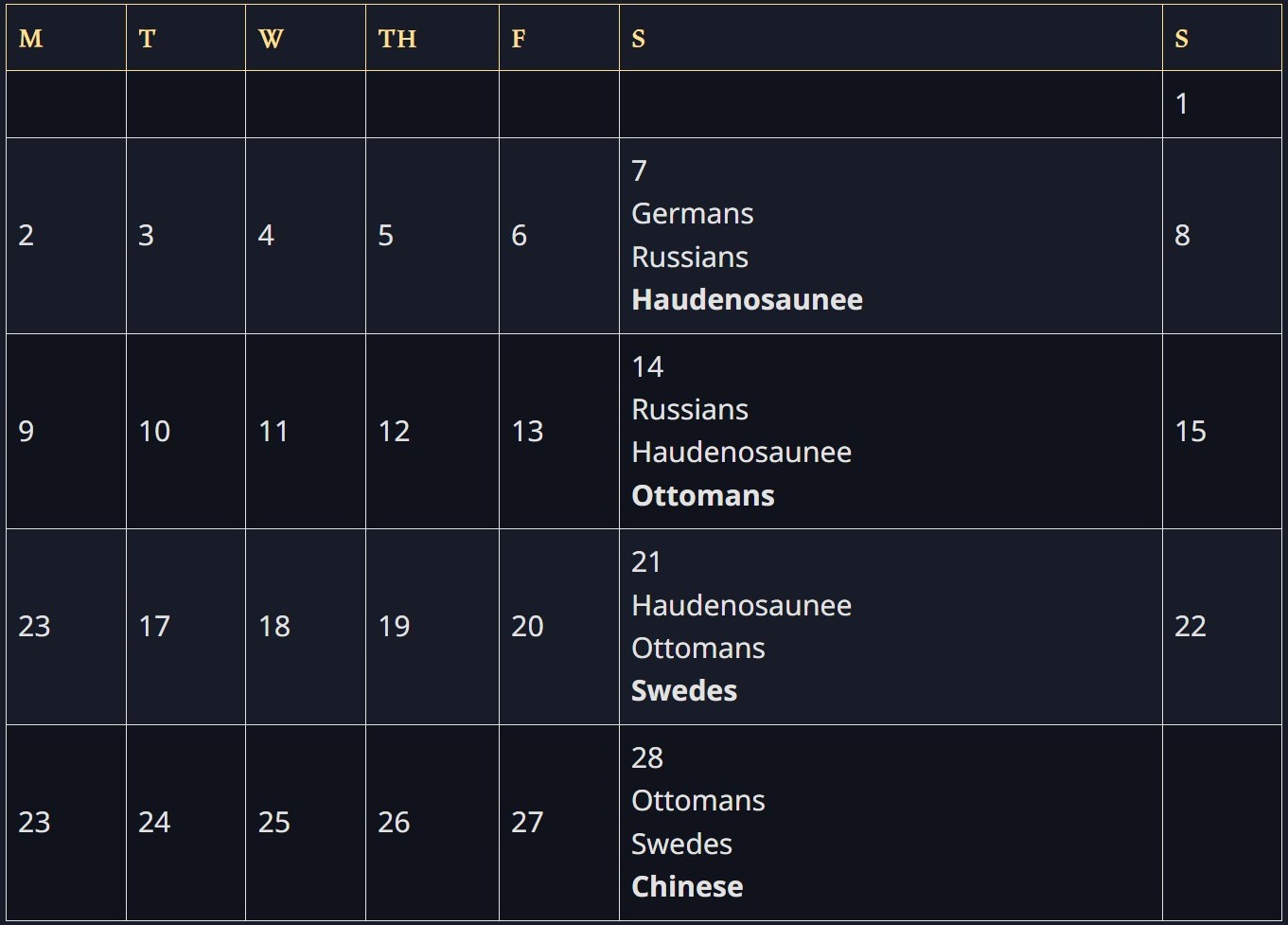 Below, any civilizations that are in bold are the newest, featured civilization for the week!