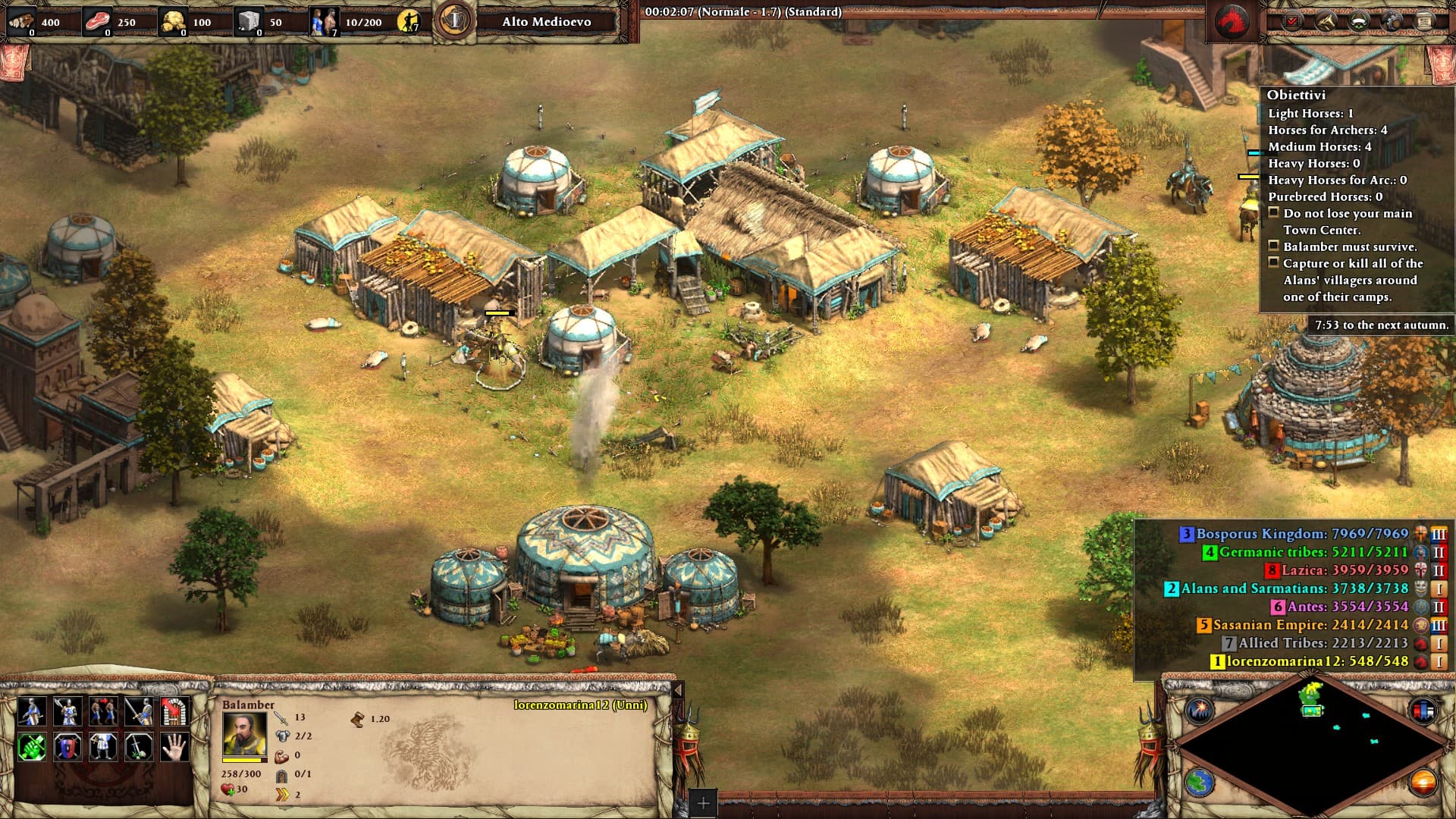 You have three heroes for this scenario: Balamber (Attila), Basiq (Girgen Khan) and Kursich (Bleda). Of these only Balamber need to survive, the other two will respawn at your TC once defeated. All the heroes can obtain experience in different ways and gain their own ability and units/stats to boost through their aura.
