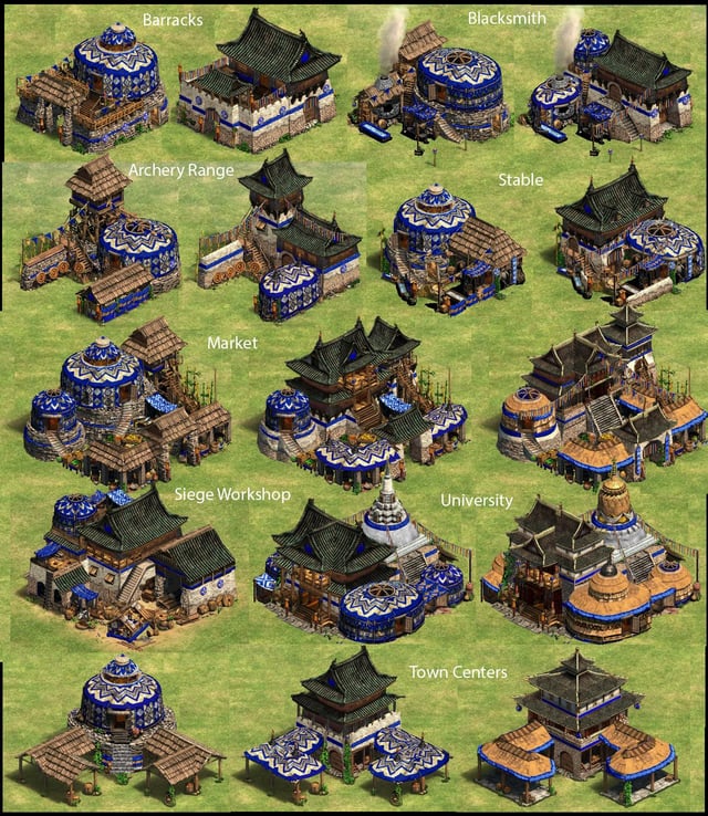 Even if the design adopts the idea that buildings upgrade in visual with the Ages, transitioning from simple structures like yurts to more complex constructions, I still believe that only certain types of buildings could become that elaborate in the end, such as the Castle, Tower, and University. Other types of buildings only need to be upgraded to a certain extent. In particular, standard military buildings like the Barrack, Stable, and Siege Workshop should retain simple, easily relocatable structures, reflecting the high mobility of Mongol armies and the base-free nature of nomadic warriors.