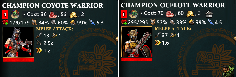 On the other hand, Coyote warrior has higher pierce armor than Ocelotl warrior but way less hitpoints and attack, and no jump ability. Even against atlanteans Ocelotl warrior performs better in most situations.
