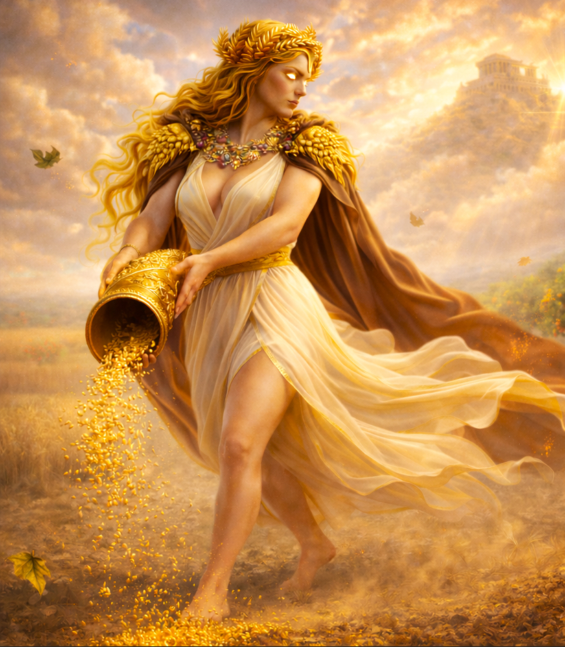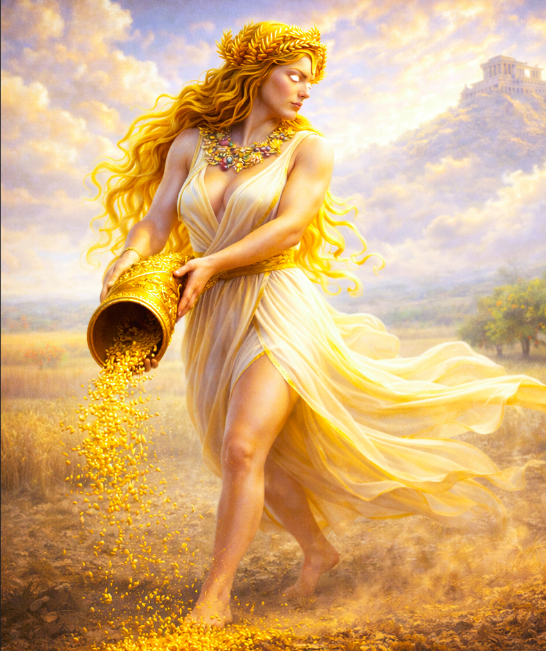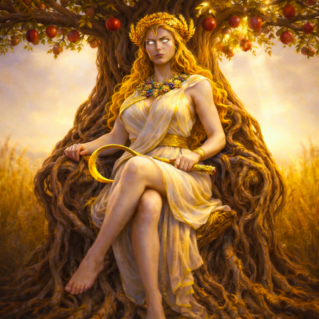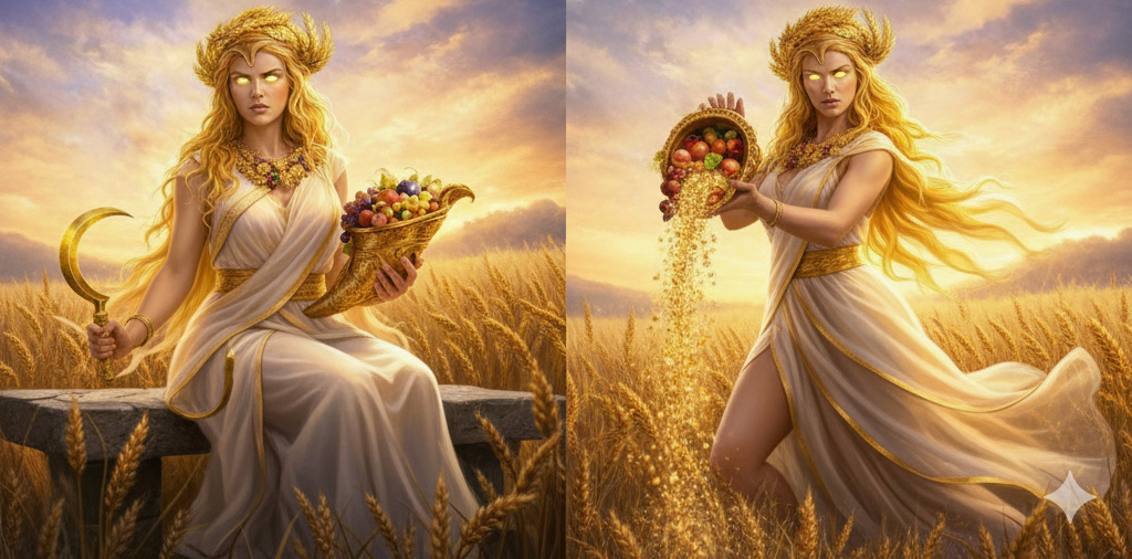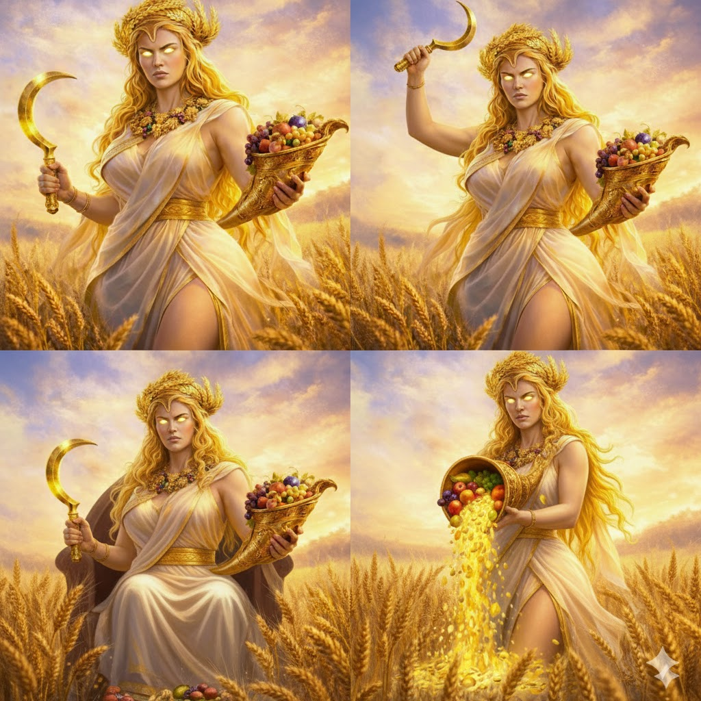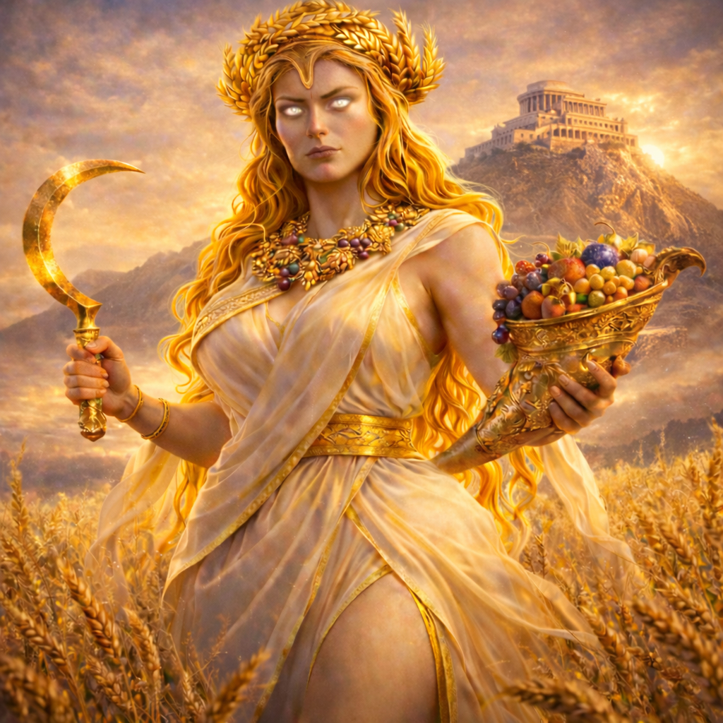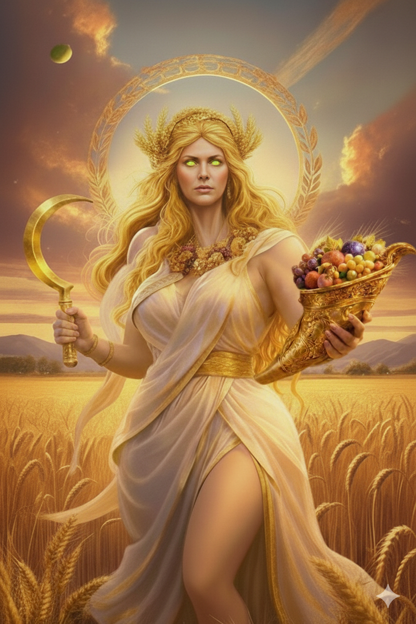 maybe you weren’t there when the ingame statue of Demeer got share. she actually hold a sickle and a horn full of fruit in her hands.