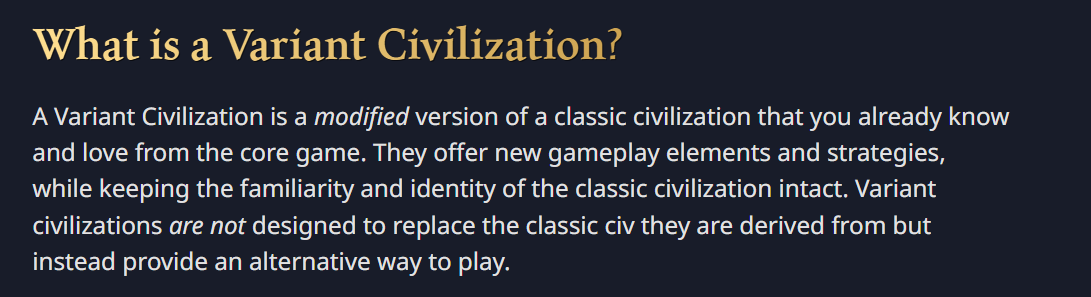 I’m proposing a small set of changes that could be made to these civs WITHOUT having to create new assets or drastic changes and WITHOUT any real sacrifice of the work already done on them. My suggestions are as follows: