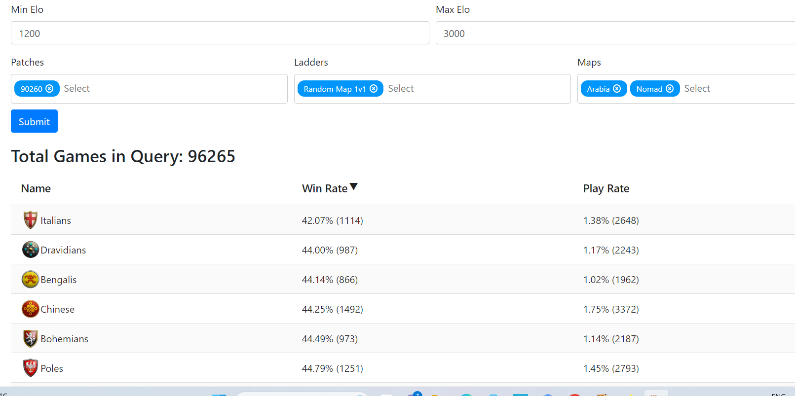 Bottom 2 on Arabia and NOmad with less than 45% winrate, Iâm not surprised. Because, they have too many gaps in their tech tree which needs to be fixed. E.g They are not a meso-civ yet they donât need stables.