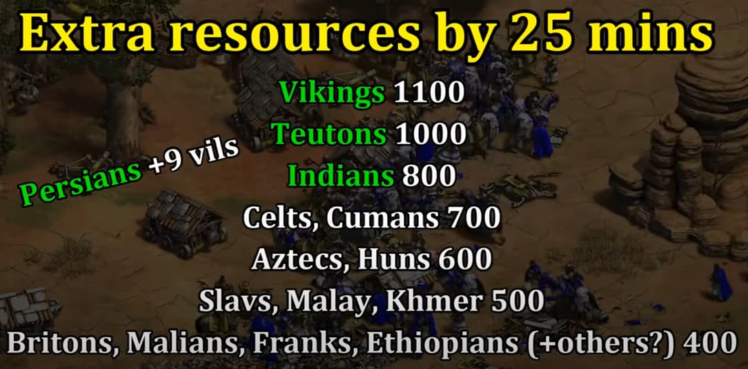 For a poor offensive civ like Dravidians to be viable on Arabia/Arena, the resource collected has to be in top 5. Just for reference a old Spirit video on booming civs. 400 resources does not even make it to top 10.