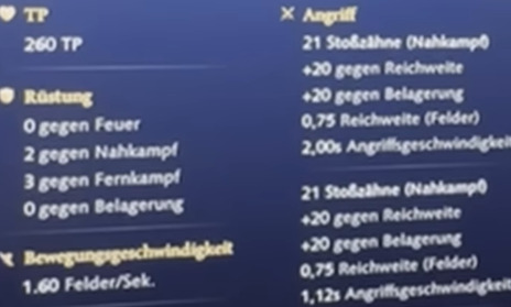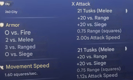 350 HP 0/2 armor tusk dmg 15 (AOE), trample 10 (AOE) 20s CD on trample to get in and cause hell. Spear attack of 17 at 1.75 att spd, with bonus vs infantry!! walking speed of 1.44 to 1.625 TPS, trample doubles the speed for 10sā¦crazy