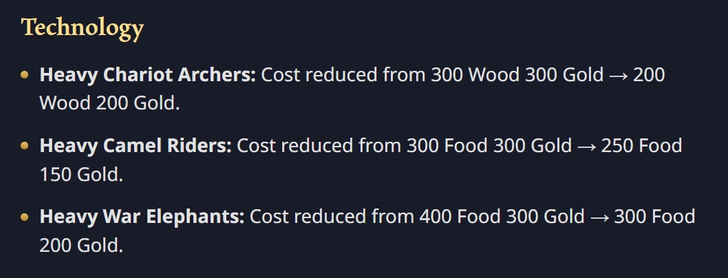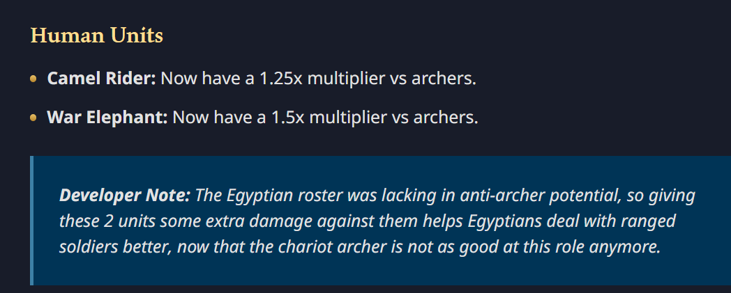 Well, guess theres that, no more point keeping at this, at least the posts serve for other interested people that the minor god and unit are viable. Just to hammer the point home about how you patch notse is missing the context heres the developers notes on it, its not targeted at elephants, they are part of changes done to several units. Its not them being targeted because the poor unit sees no use.