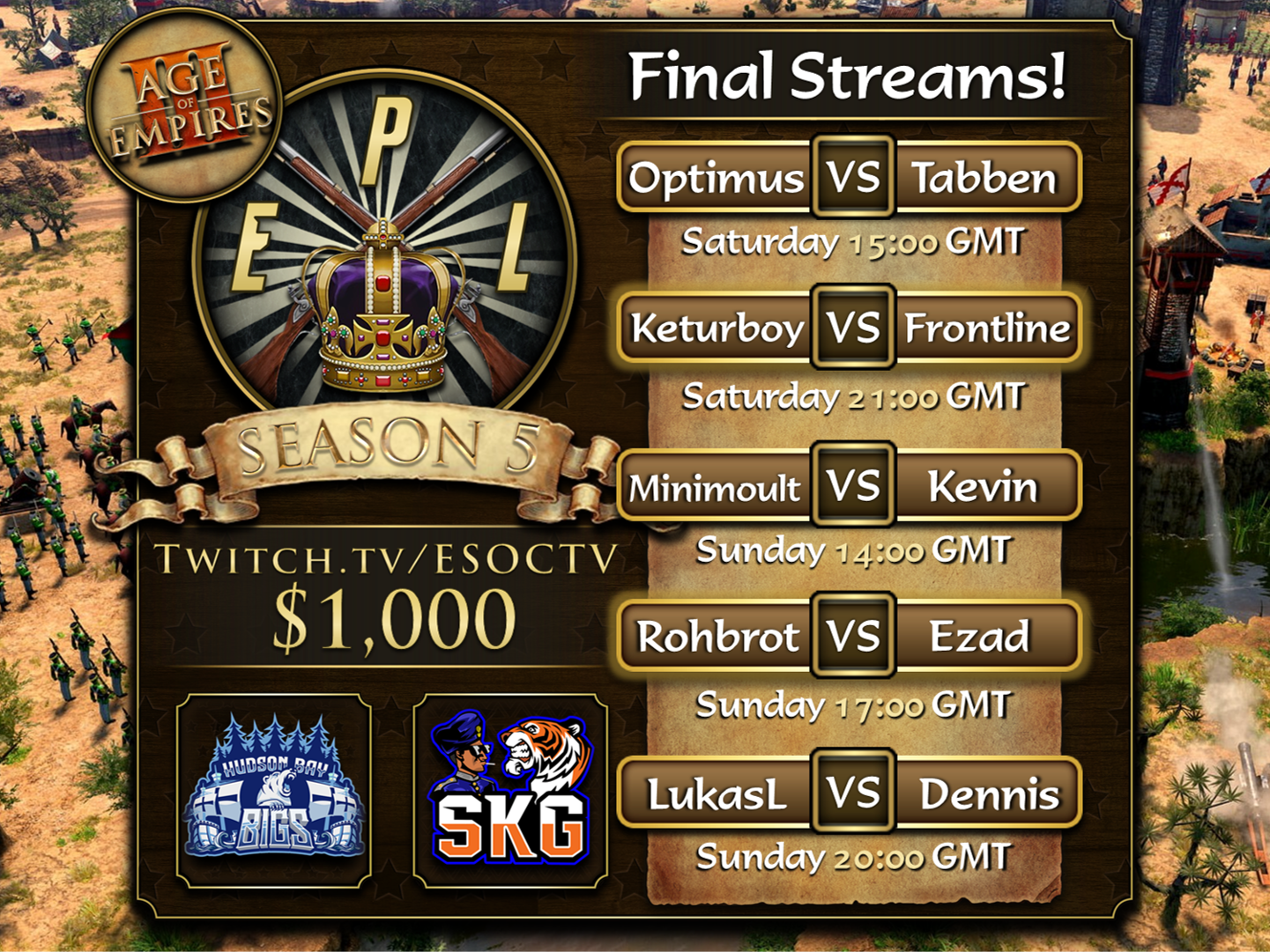 The Hudson Bay BIGs take on SKG in the GRAND FINAL weekend of ESOC Premier League Season 5! Don’t miss this huge finish to a historic season of AoE3, LIVE on ESOCTV, or on ESOC YT ! Grab your friends, your allies, and even your foes, this is the ultimate battle for the championship, and you don’t want to miss it!
