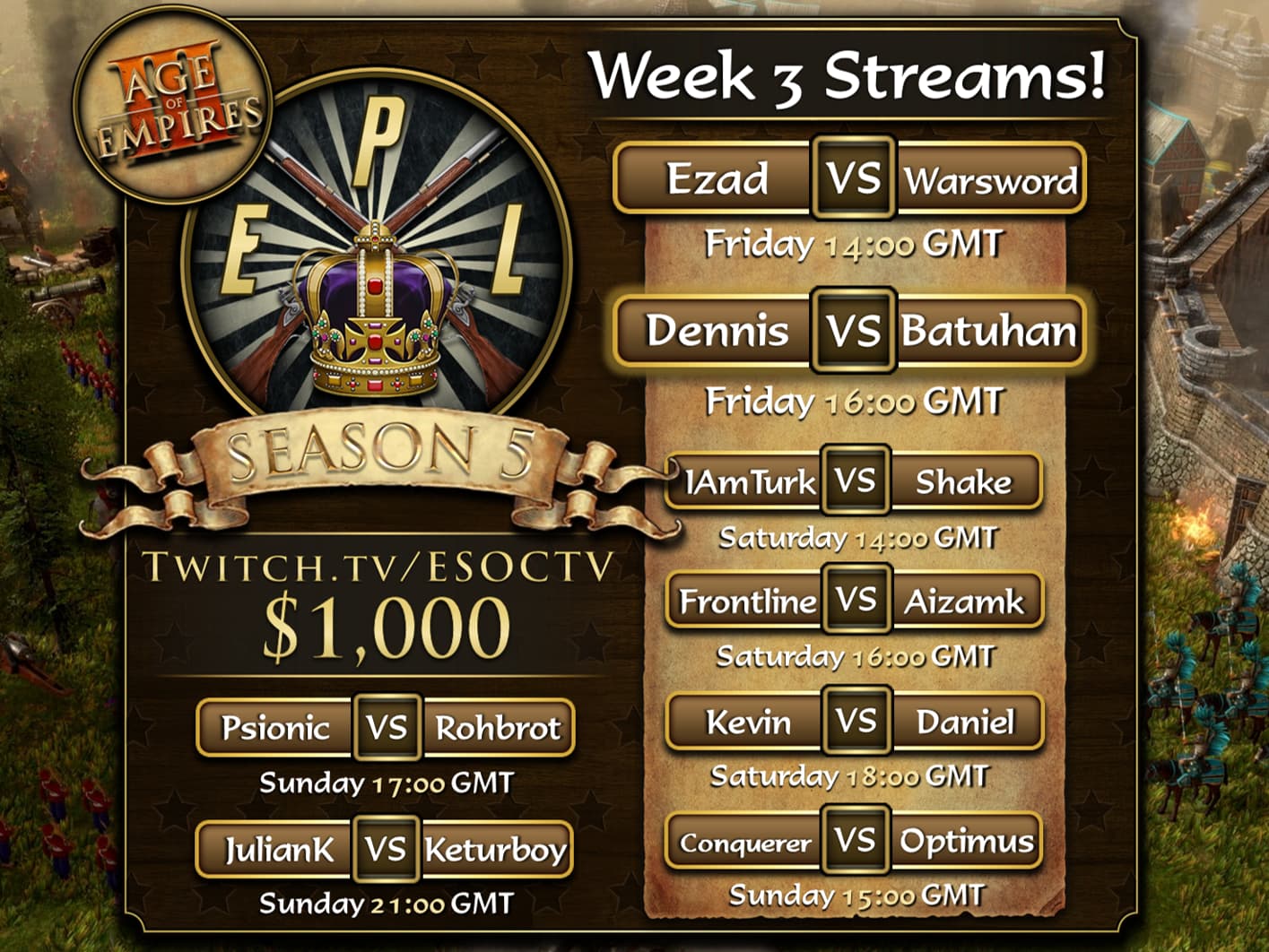As one historic event ends, another is ready to take its place in this legendary era of competitive AoE3! We’re back and fired up for another record breaking tournament with EPL Season 5! 20 of the best players in the game will spend 3 weeks fighting for every possible victory, where each win gets their team a step closer to the final playoffs in Week 4! Players will be auctioned off in an ESOCTV Live Stream May 31st, so tune in for exclusive coverage!