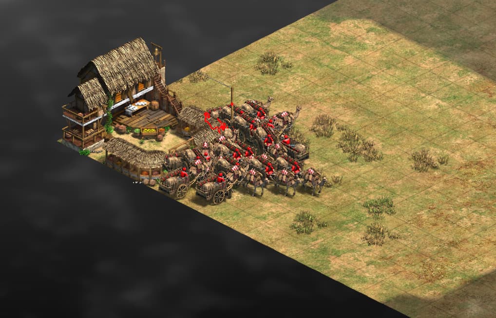 The AI player will boom and eventually cut through the middle forest to attack the player. While building up, it will create trade carts as expected but they will be forever commanded to trade with the neutral market (roughly once per second) and never make it back to their own market to deposit the gold.