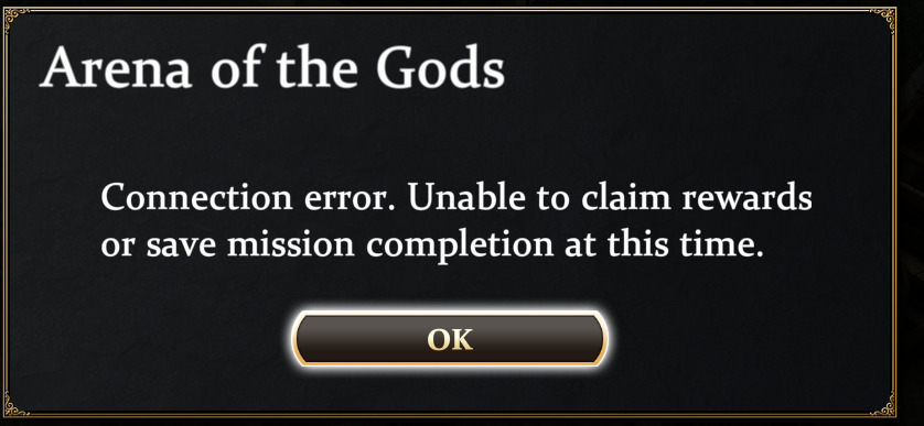 Simply reopened the game from Steam. I had already completed 1 or 2 levels in this Gaunlet Labyrinth. IMPORTANT: Gaunlet failed to load for a few minutes: Initialization failed notification as seen in the image above. Then I got a pop up: “Arena of the Gods Connection Error. Unable to claim rewards or save mission completion at this time.”