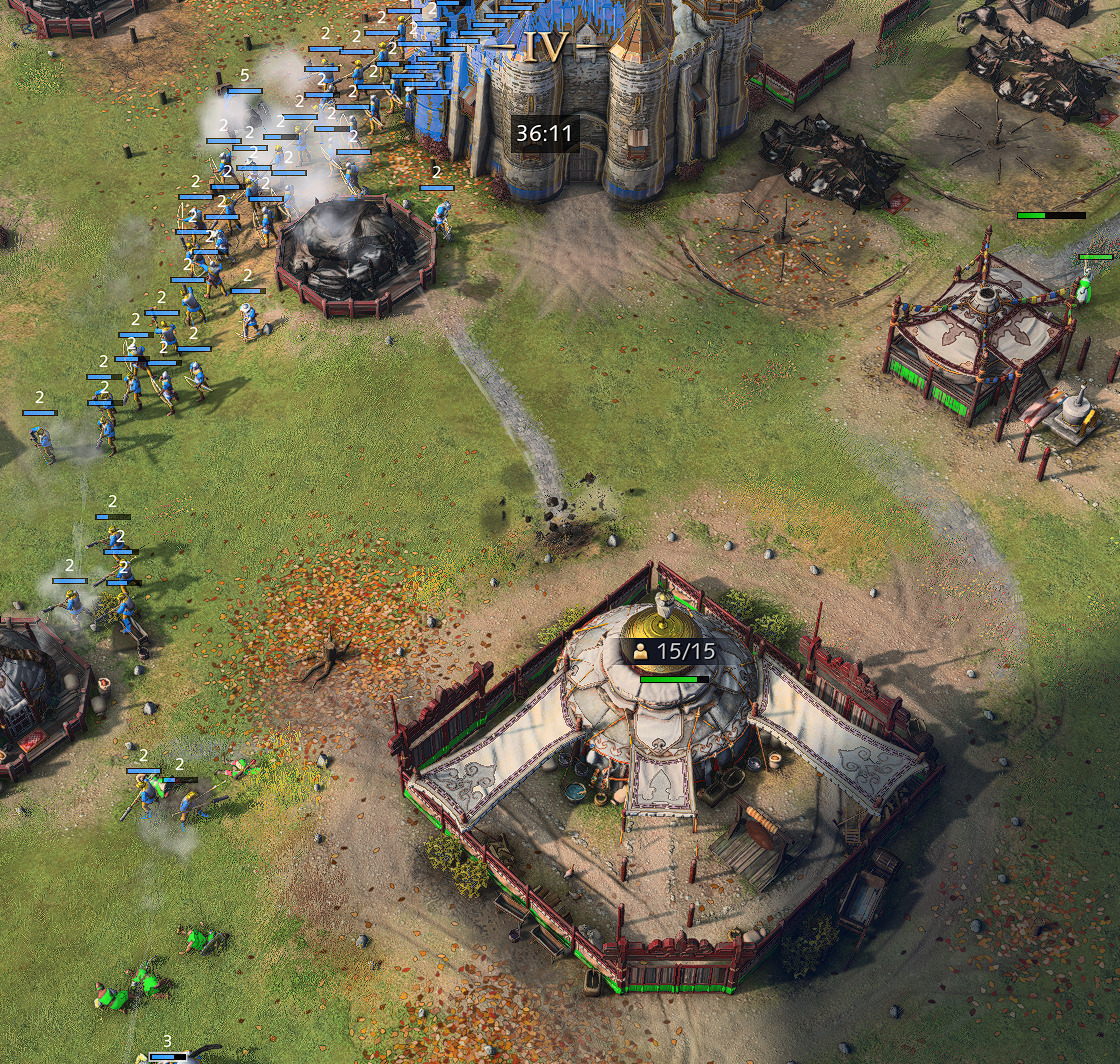 Issue: Golden Horde town center does not take damage from French Cannon. Torch damage appears normal, and the Cannon will target and fire at the town center, but the impact appears a few feet away from the building (looks like an invisible forcefield, see picture) and no damage is registered.
