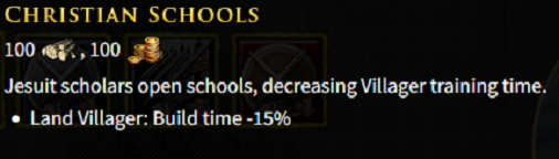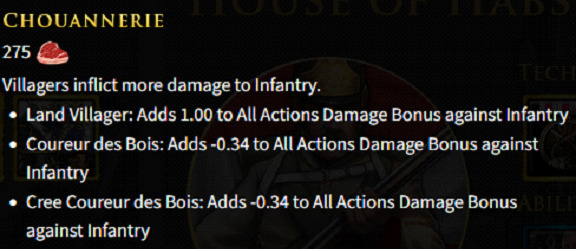 Then there are the techs that will give you much less stats if you get them after, due to the change from “AbstractVillager" to “LogicalTypeAffectedByVillagerUpgrades”, this includes Nootka Bark Clothing, Great Coat and Apache Cactus Use & Blunderbuss which gives much less stats if they are researched after the revolt.