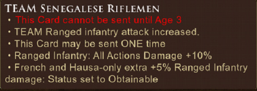 So for example the Team Senegalese Riflemen card gives 10% ATK to all range infantry (+ extra 5% if you are French or Hausa) when it arrives, meaning that all units that are currently in the game or can be created in the game would get this stat boost if they are tagged “AbstractRangedInfantry”