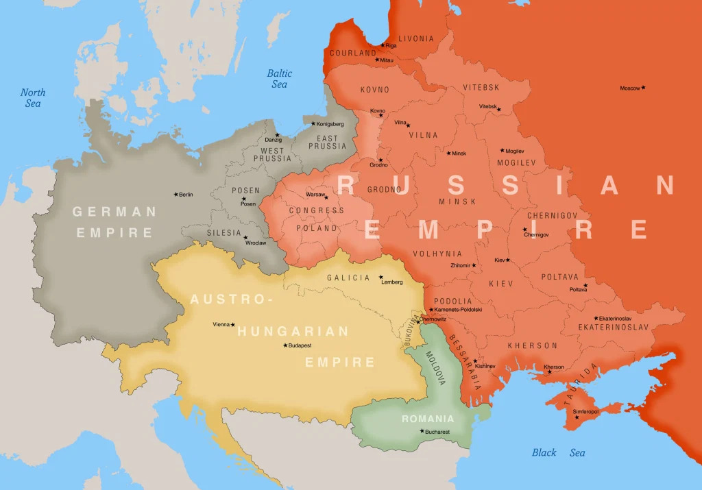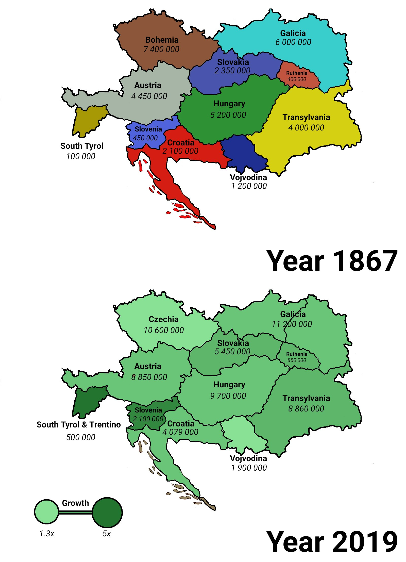 Austro-Hungarian Empire (I couldn’t find a nice map like the one above - comparing the old borders with the present ones. The map shows A-H Empire in 1867 - after the demolition of PLC, the borders did not change drastically)