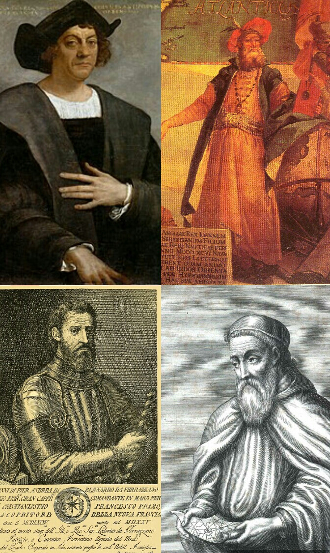 Clockwise from top: Cristopher Columbus, John Cabot, Amerigo Vespucci and Giovanni da Verrazzano