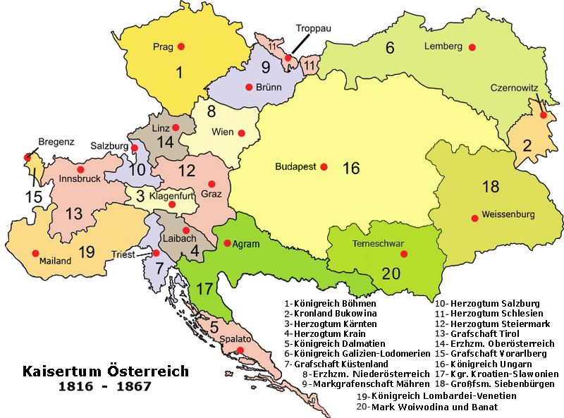 The Austrian Empire encompassed the territory of present-day Austria, Hungary, the Czech Republic, Slovakia, Galicia (after the partitions of Poland), Slovenia, Croatia, and part of northern Italy and northern Romania (Transylvania). This Austria was definitely different and more interesting in terms of nationality than the rest of the German states.
