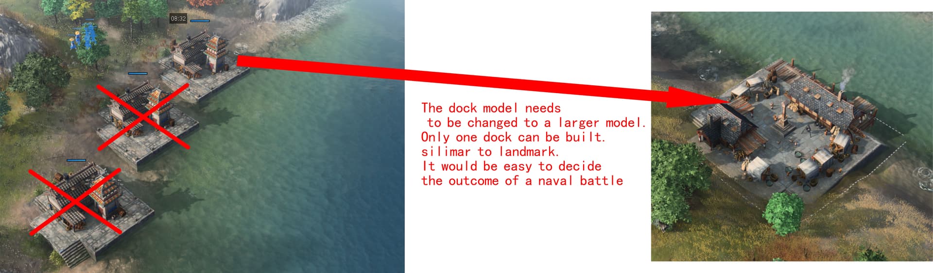 The dock model needs to be changed to a larger model. Only one dock can be built.