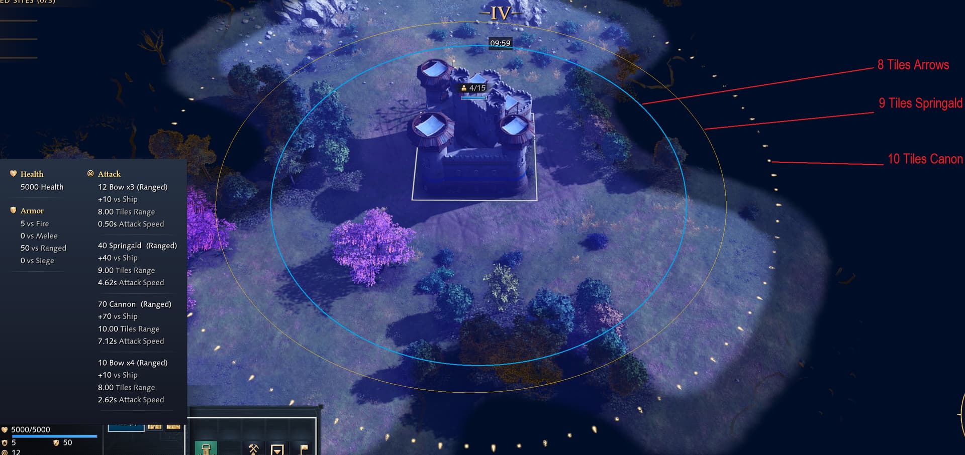 Stone Towers: Do not have the range circle at all.