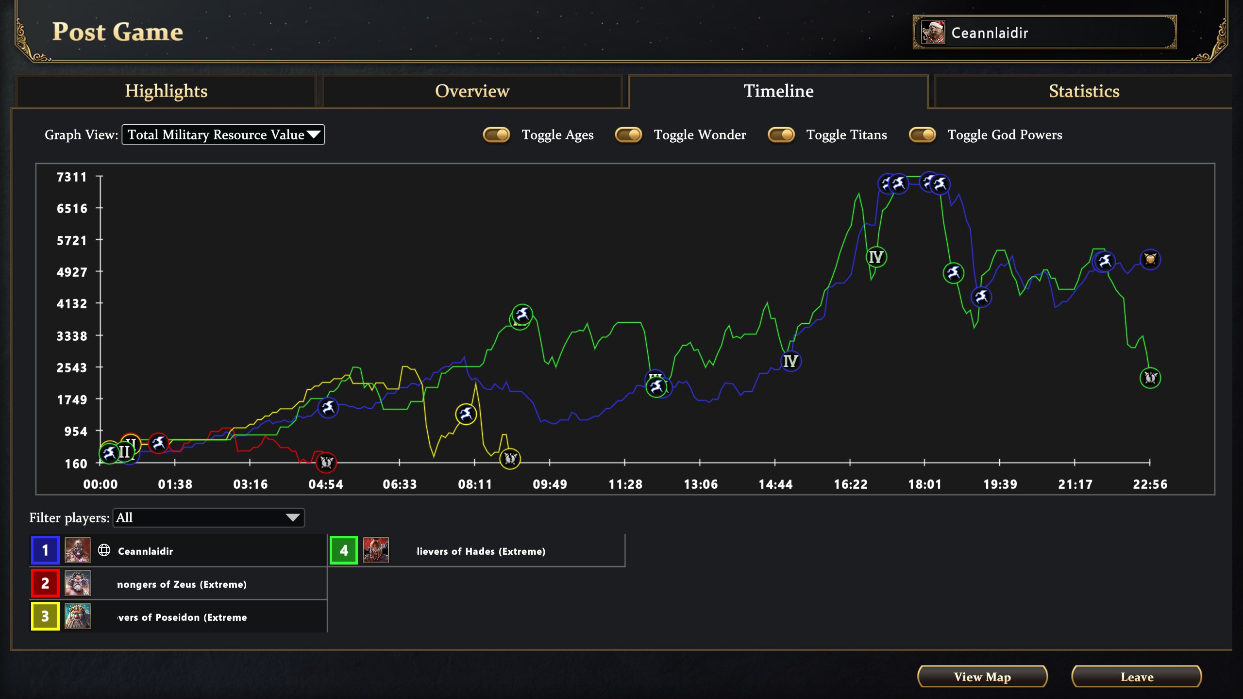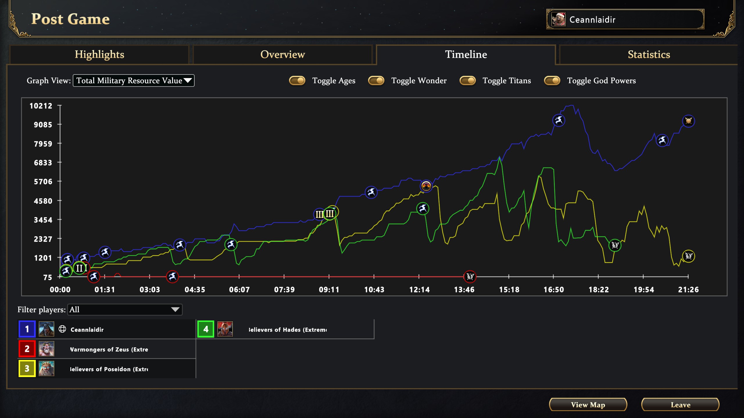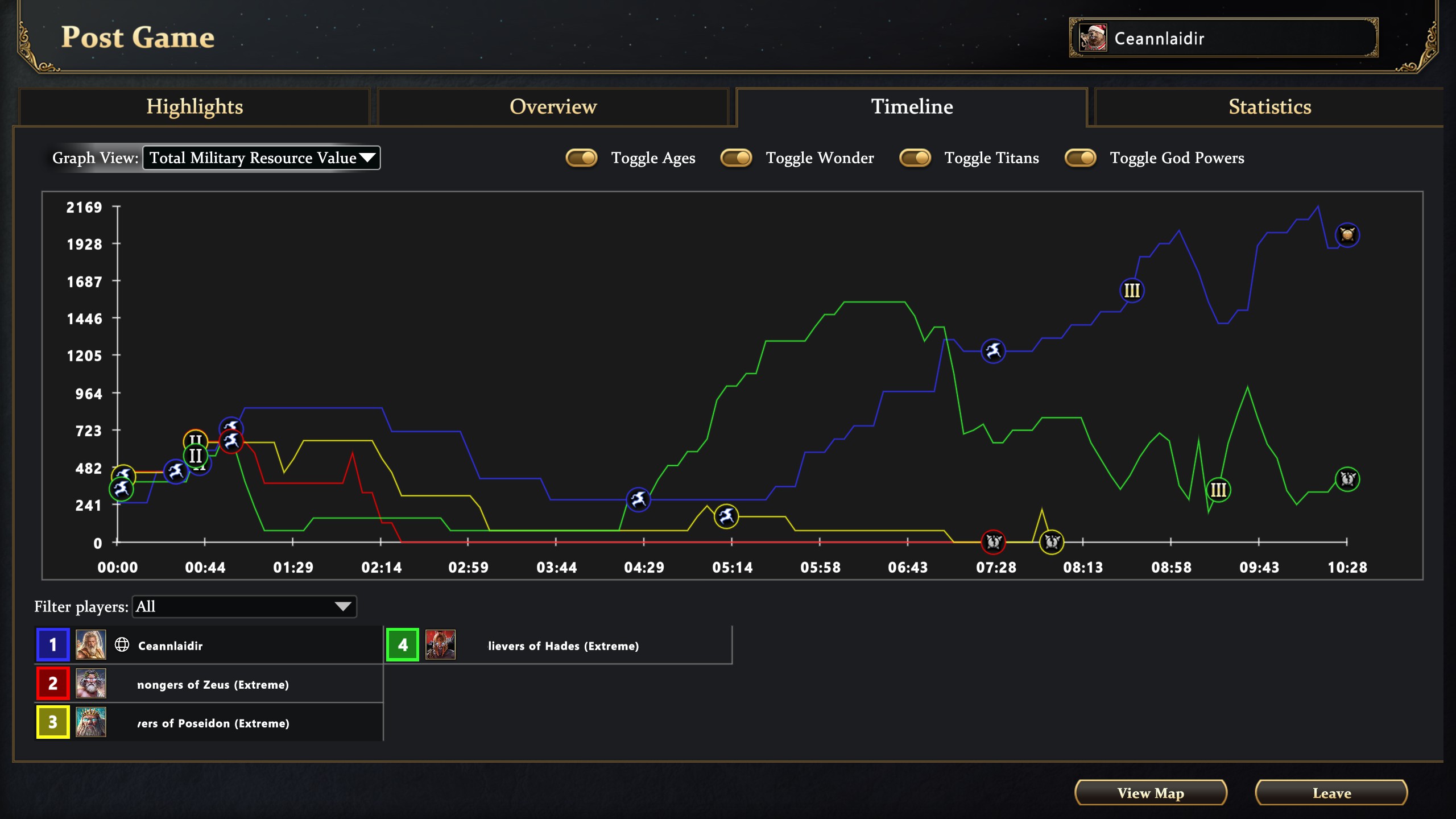 I think I killed all but just one or two villagers for each Zeus and Poseidon with Halogi and Amanra, and then I just had Halogi working down Zeus’s town center with a caladria healing him, and then as soon as soon as Zeus conceded and and Halogi was targeted at Poseidon, he conceded, too. Then I moved everyone to Hades and he conceded at around ten and half minutes. There’s room for improvement though.