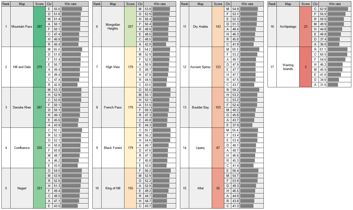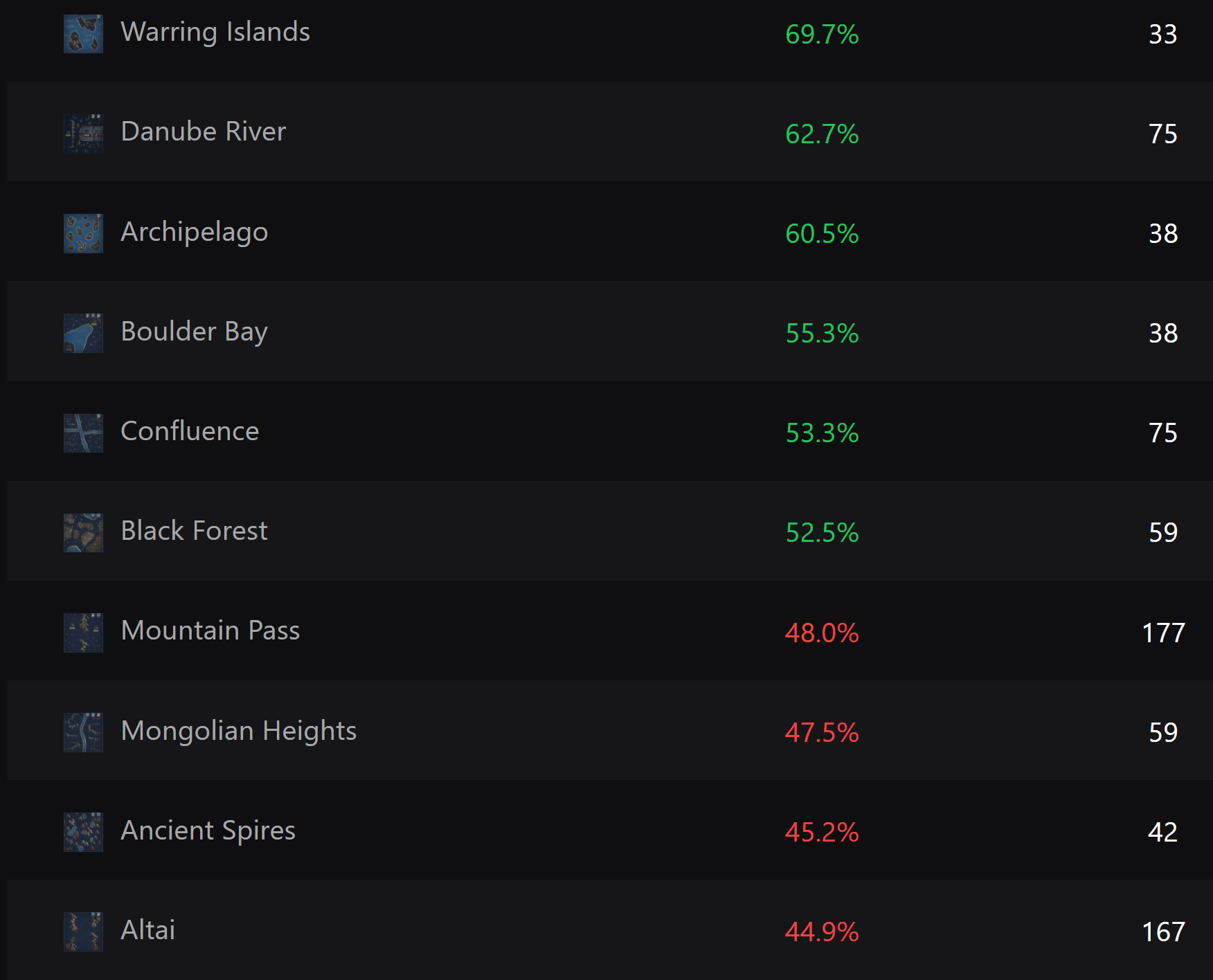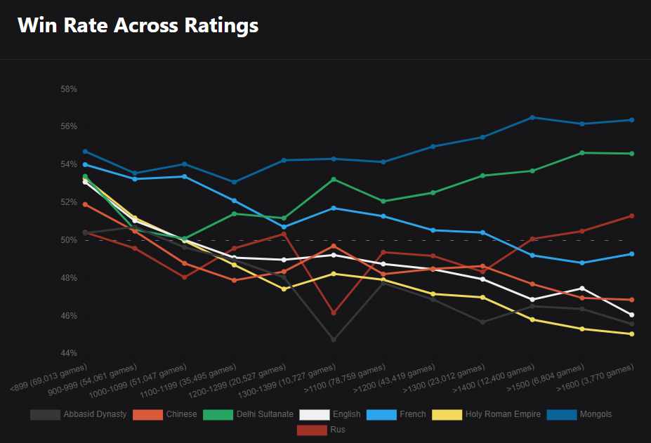 Oh, and before we forget: Part of the reason why China is above Abassid and HRE in the high MMR ratings is because of water and hybrid maps.