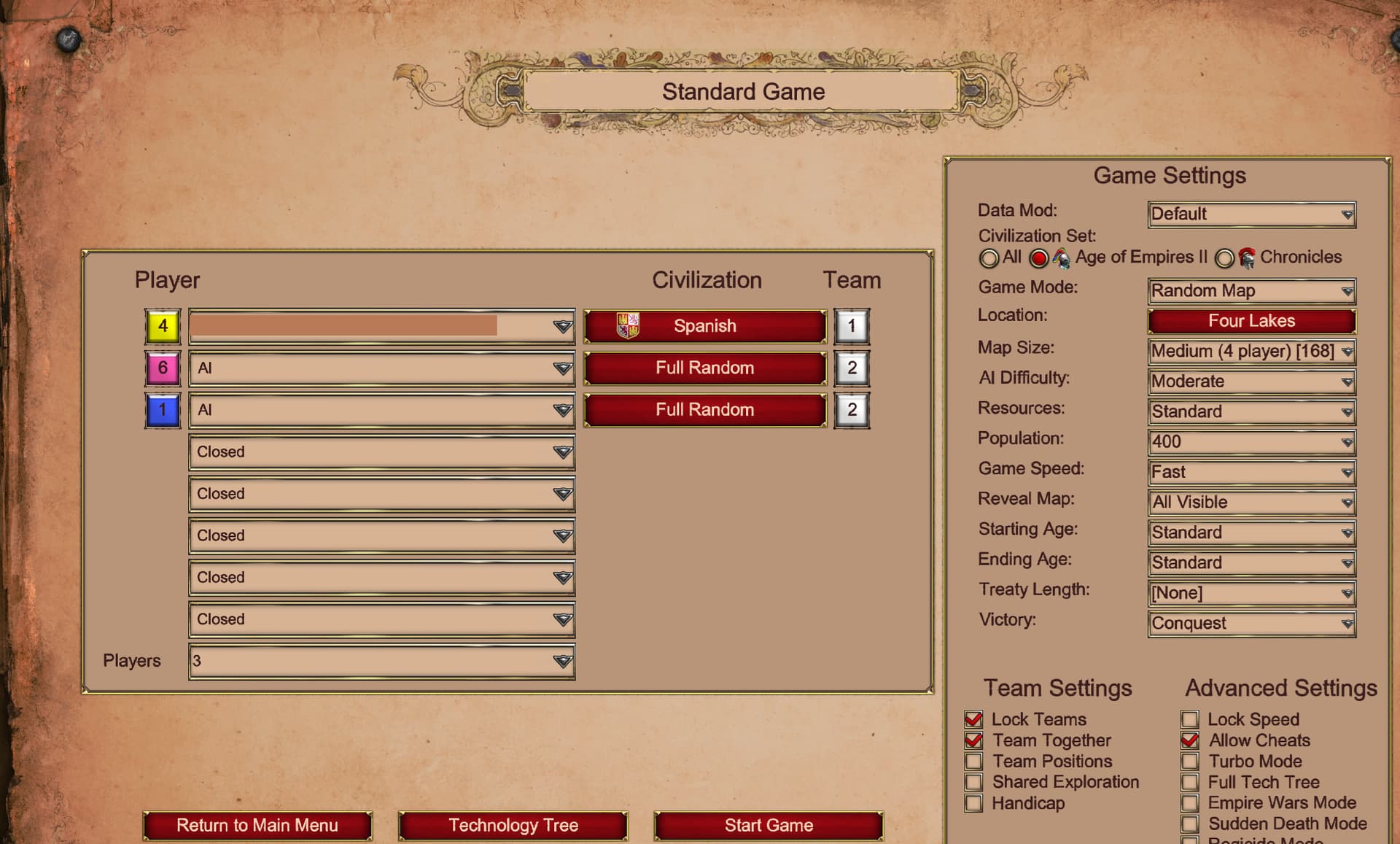 I like open maps and natural-looking ones (as much as possible, which is nearly impossible in DE), so I donât play Arena or Black Forest. Nomad isnât appealing to me because they give you so many starting villagers, and at like three different places on the map. So, if you try 1v2 AI (Moderate) using the parameters I gave above, I wish luck.