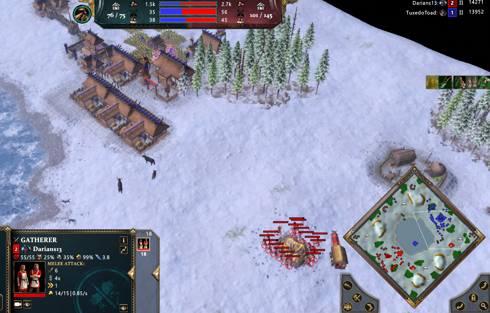 Same dynamic as before, his vills are wide open and you are not taking advantage of that. His army is also slow, mainly being trolls, godi and throwing axemen. all bad units to chase calv with.