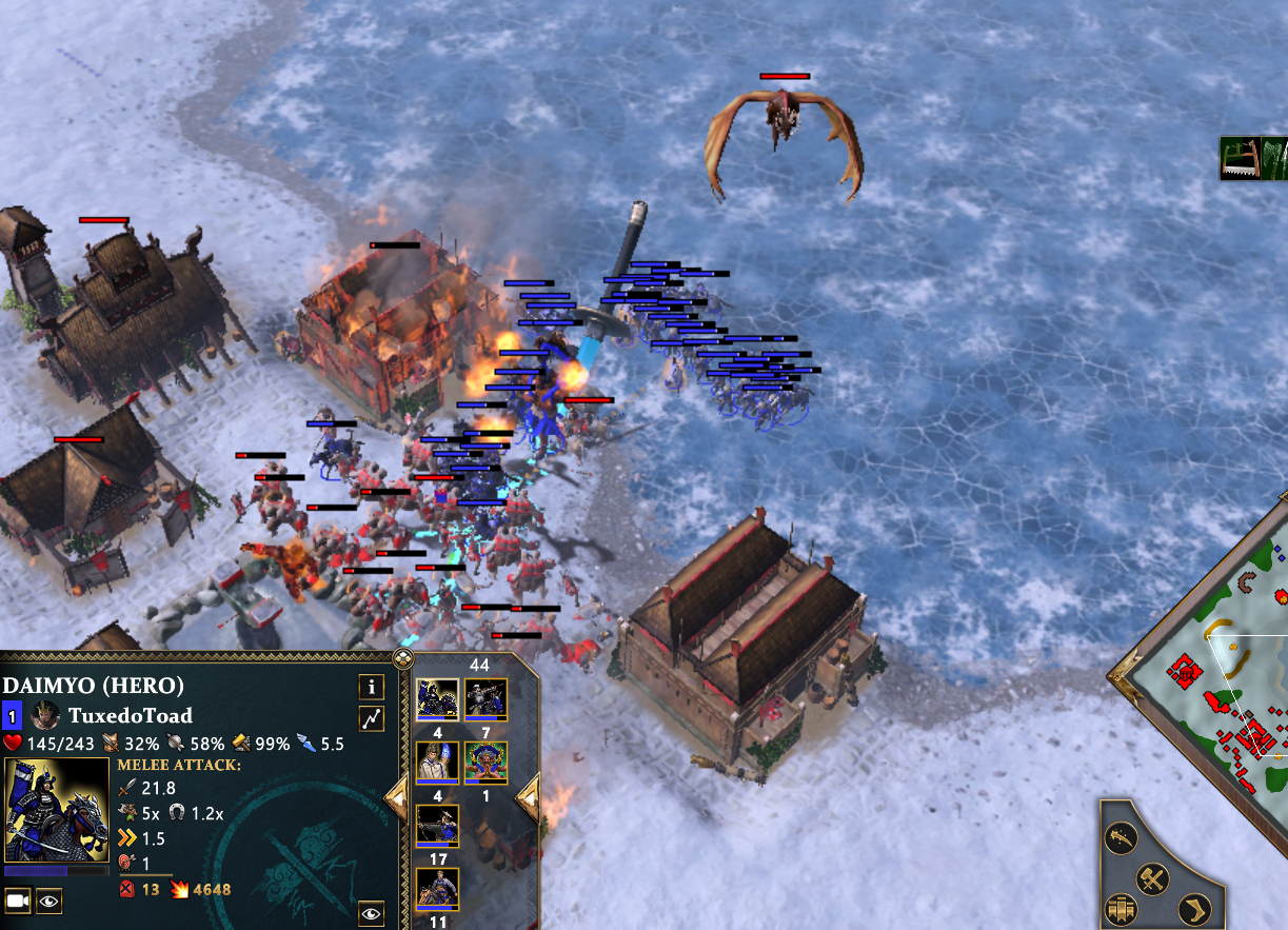 Good godpower usage. However as you can see you have only 4 heroes that can target the dragon and they dont even target it fast, they first clear all the other units and then move into the draon, which costs you all your archers. You didnt make bushi (hero archer) through most of the game and it costed you