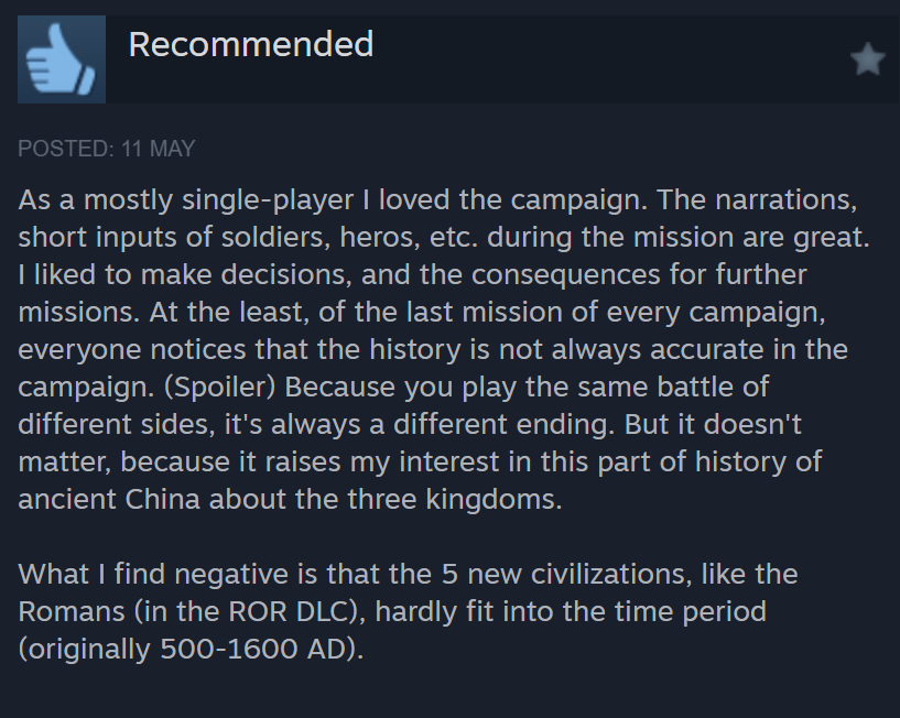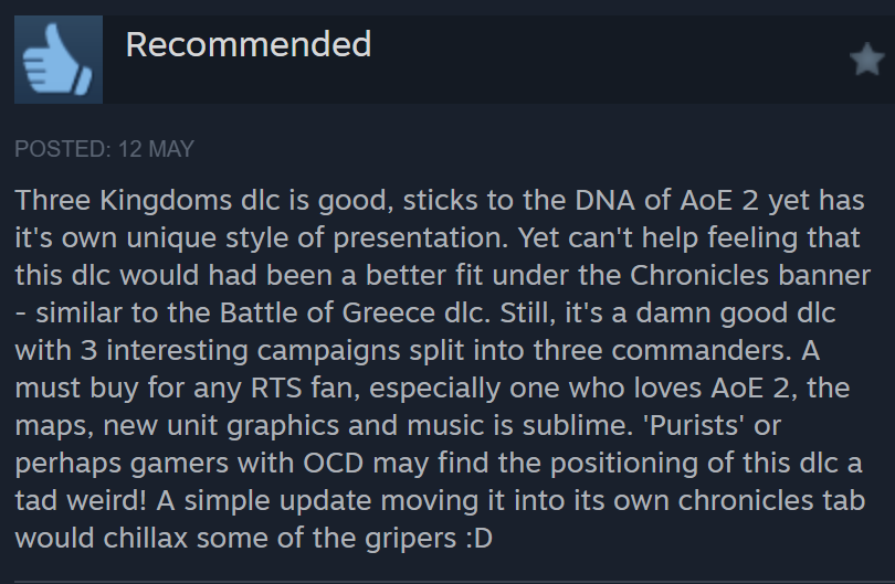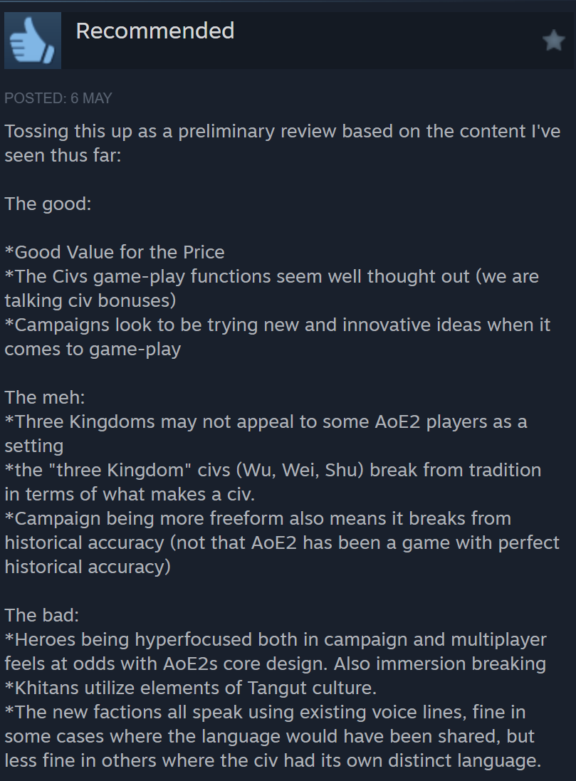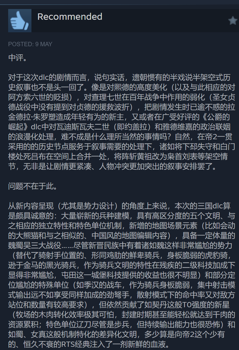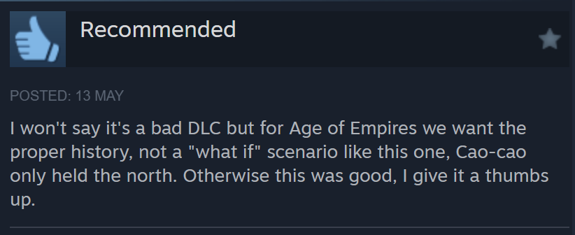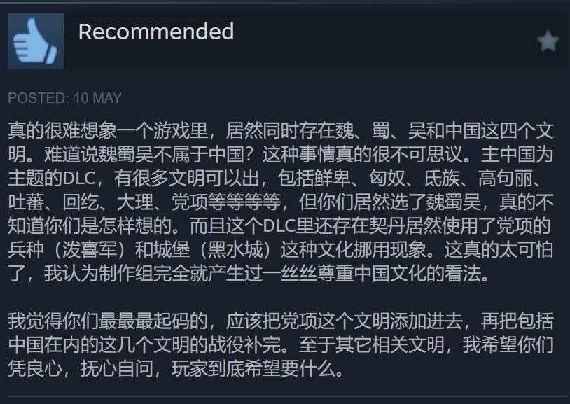 Translation: Hard to believe that a game simultaneously have Wei, Shu, Wu, and Chinese civilizations simultaneously. Are Wei, Shu, Wu not Chinese? It’s unbelievable. For a China-based DLC, there are many civs that could be created, including Xianbei, Xiongnu, Di?, ??. Bodpa (Tibetan), Uyghurs, Dali, Tanguts etc etc, but you chose Wei Shu Wu, and I have no idea what you are thinking about. Moreover, this DLC also mix up civilizations, giving Khitan Tanguts unit (Poxi Camel) and castle (Kara-Khoto). This is very scary. I think the devs has thin respect for Chinese culture (this sentence is said in a weird way).